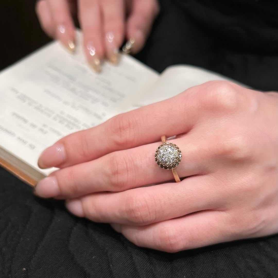 ポンポネモザイクリングは、ポンポネのデザインにパヴェ技法を組み合わせたシリーズです。センターに敷き詰めたパヴェは、6mm、8mm、10mmの3サイズ展開。