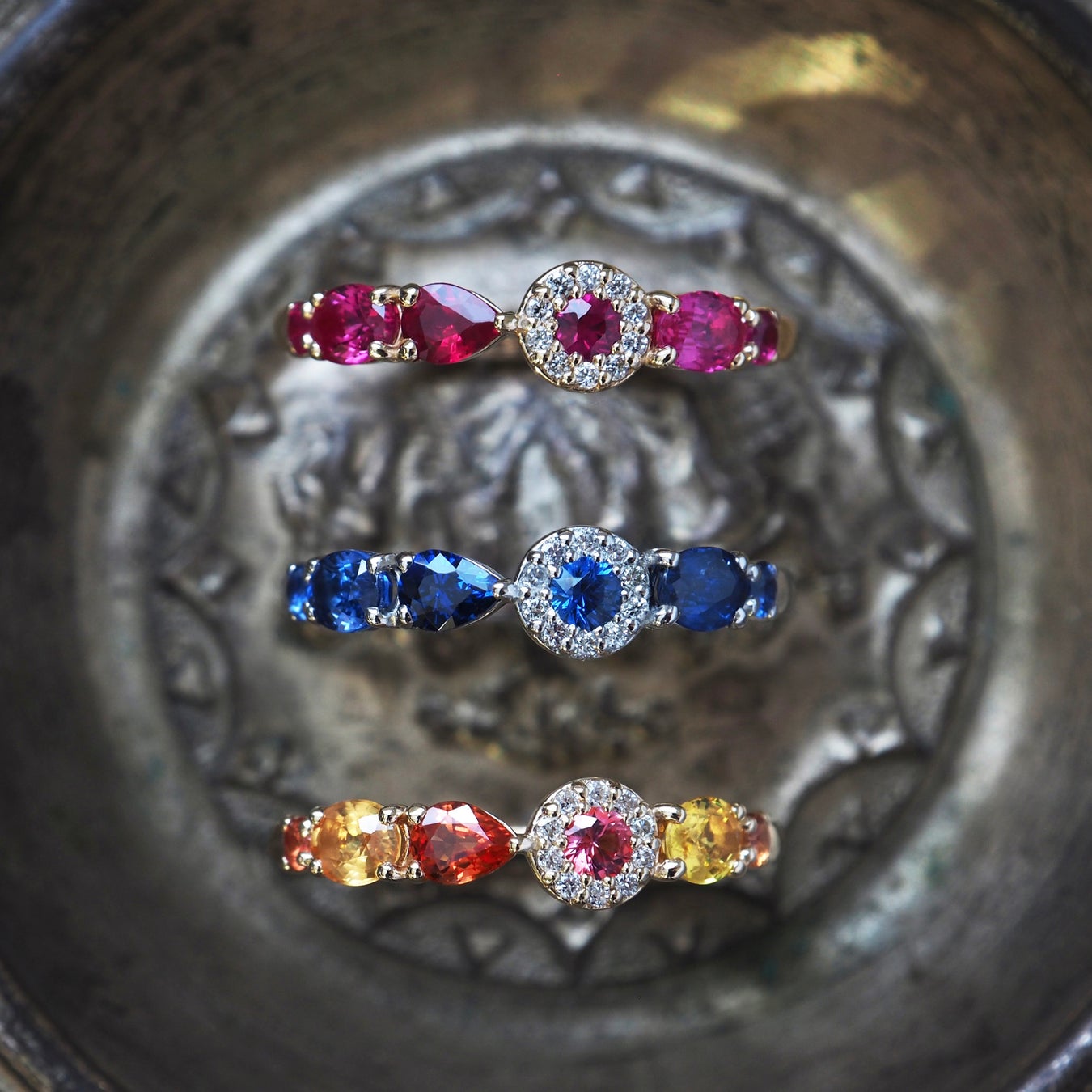 「サンクルール」は、“100の色彩”を意味するシリーズ。さまざまな形や色を持つ宝石を一本のリングに配し、まるで宝石箱のような世界観を表現したコレクションです。