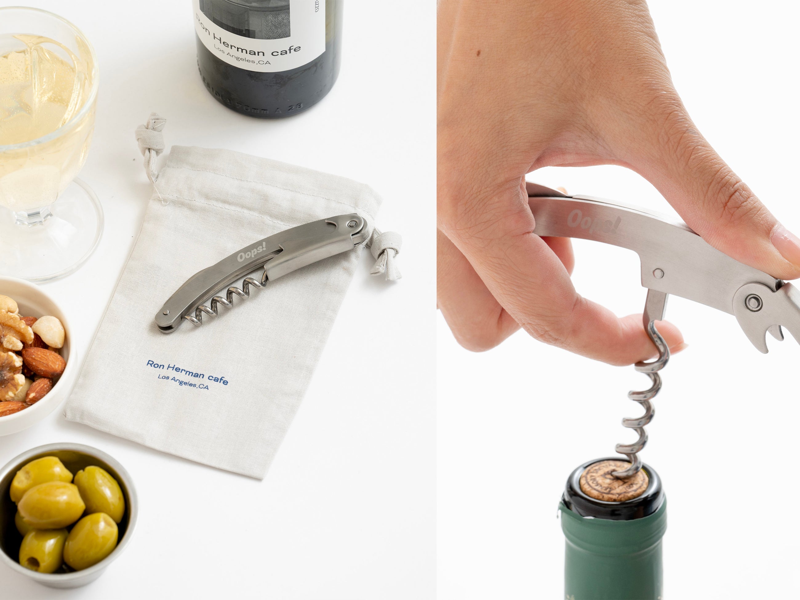 ロンハーマン カフェ初登場となるワインオープナー。テコの原理でコルクを引き抜く折り畳み式のソムリエナイフタイプを採用しました。スクリュー、ハンドル、ボトルに引っかけるフックに加え、キャップシールを剥がすためのナイフが一本に集約されており、ご自宅での使用はもちろんのこと、外出時には付属のグレーバッグに入れることで持ち運ぶことが可能です。また、ワインを開けるときに気を付けてというメッセージを込めて、Oops!(おっと!しまった!)という意味のユニークなロゴを刻印しています。