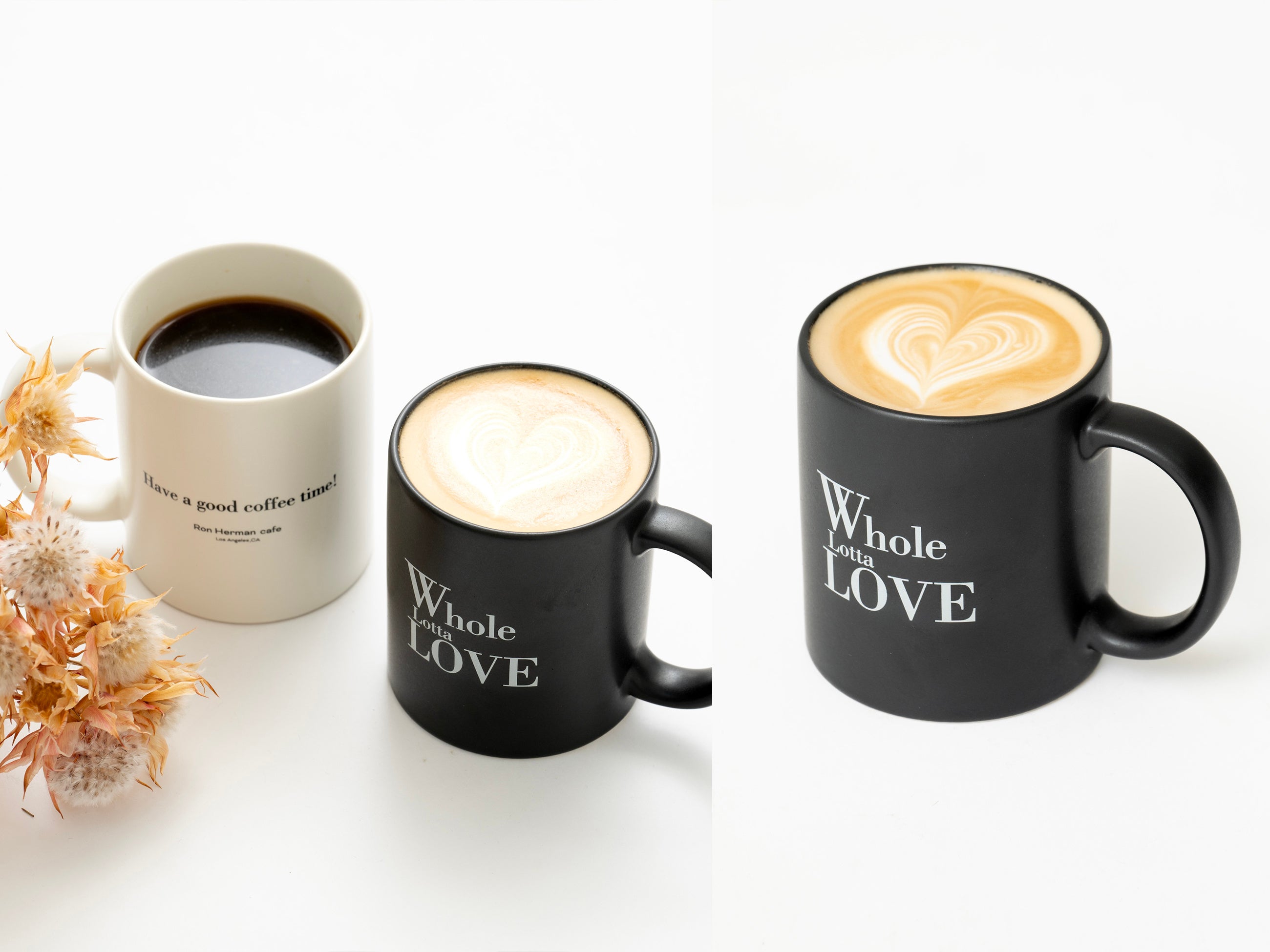 手に馴染むやわらかなフォルムと、ほどよい重みが心地よい、ロンハーマン カフェでも欠かせないアイテムのひとつのマグカップ。やわらかな色合いのアイボリーとシックな色合いのブラックの2種類をご用意しております。正面にはWhole Lotta Loveのロゴを配し、裏面には”Have a good coffee time”(楽しいコーヒータイムを)という想いをこめています。コーヒーだけではなく、紅茶やハーブティ、時にはアイスドリンクなど、日常的に使用できるアイテムです。