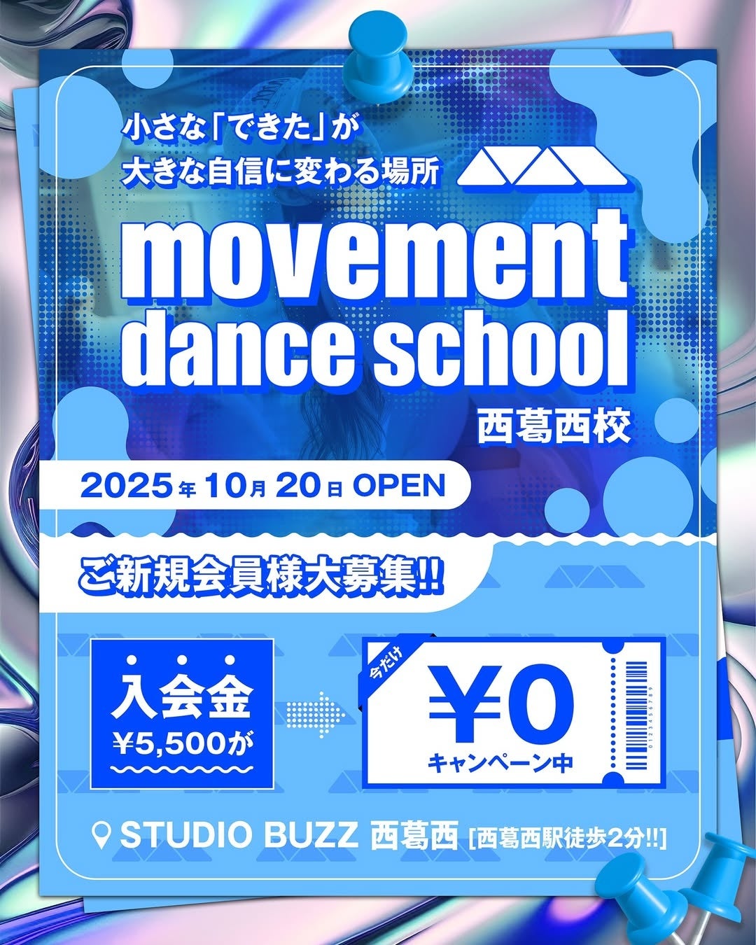 上野を代表するダンススクール「movement dance school」のフランチャイズ展開として、株式会社BUZZ PRODUCTIONS(本社:東京都港区)は、2025年10月20日(月)にmovement dance school町田校・西葛西校を同時開校することを発表いたします。本家上野校で培った指導ノウハウを受け継ぎ、メジャーアーティストのバックダンサー経験を持つプロ講師陣による本格指導と、町田校の2人校長体制により、東京全域で新時代のダンス教育を展開してまいります。