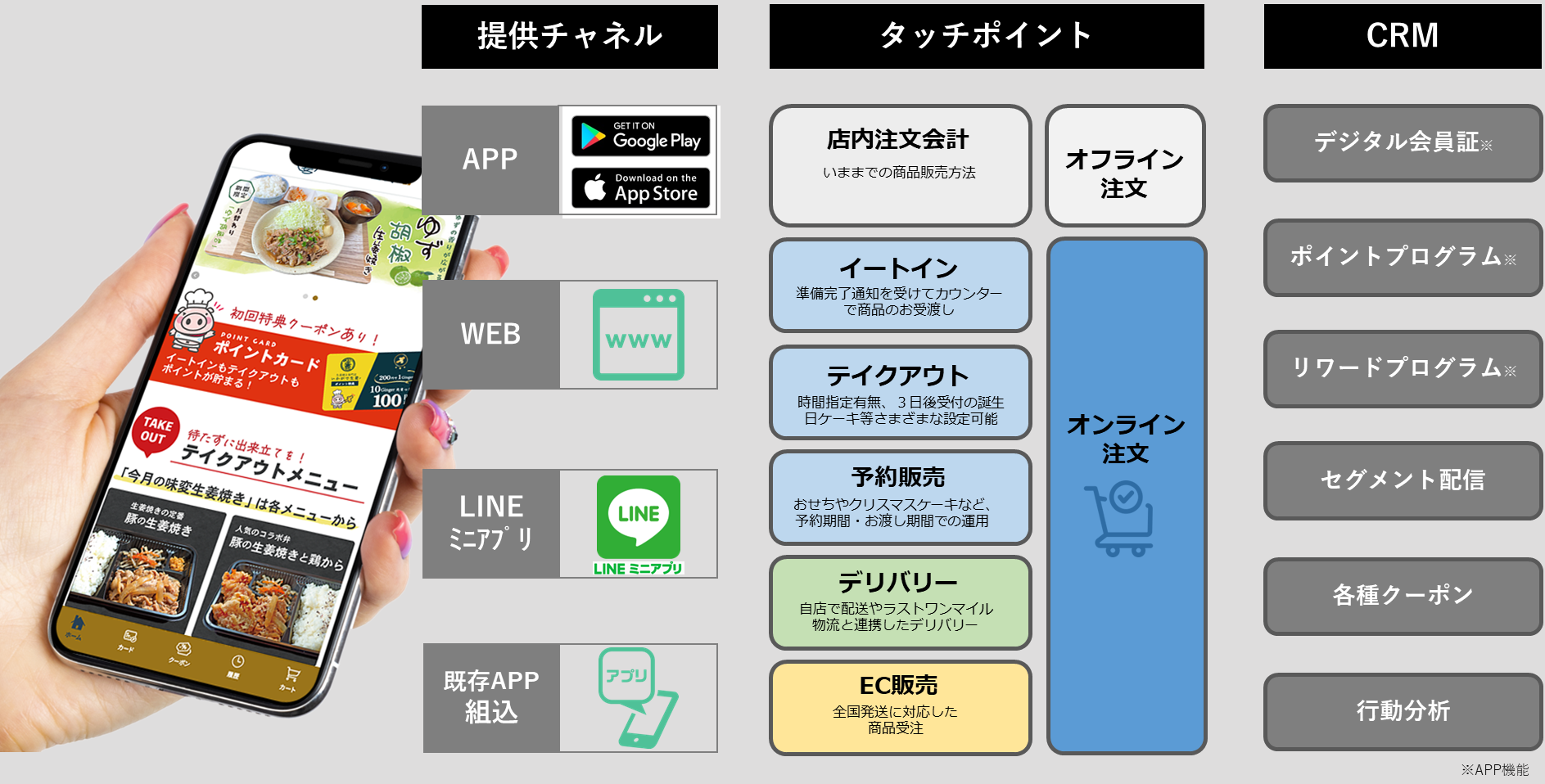 iToGoは接続性が高く、既にブランドアプリ、LINE公式アカウントなどデジタル接点がある場合は、アプリ組み込みやLINEミニアプリとしての提供もでき、早期定着化が可能になります。