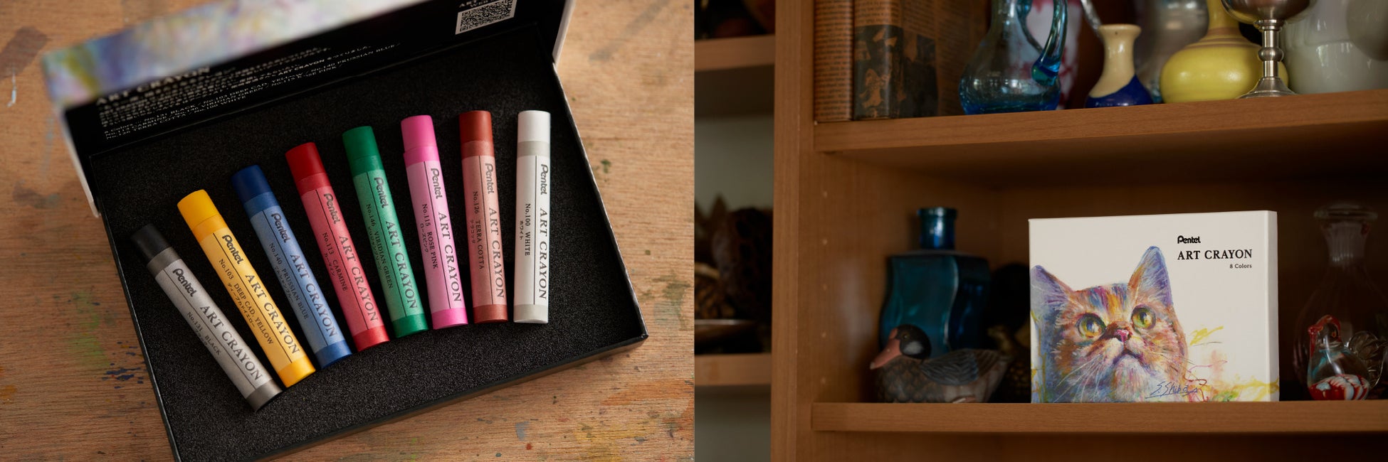 共同開発者の柴崎氏との度重なる試作検討を経て生まれた「アートクレヨン」は、仕上がり時の色の鮮やかさを重視し、さまざまなモチーフを描くのに適した最小単位として柴崎氏が選定した8色からなり、愛らしい子猫のパッケージデザインは、そのままでも飾って楽しめる柴崎氏の描き下ろし作品となっています。