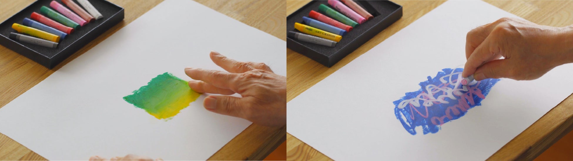 調整を重ね、色ごとに異なる最適なテクスチャへと仕上げました。伸びが良く、広い面もスムーズに塗ることができ、混色やぼかしを美しく表現できます。通常、色同士を混ぜ合わせる「混色」と、下地の色を塗った上にさらに色を重ねる「重色」とでは、相反する配合が要求されますが、アートクレヨンは、混色のしやすさを追求し、かつ重色をコントロールできる性能を実現することで、油絵のような重厚な表現を可能にしました。