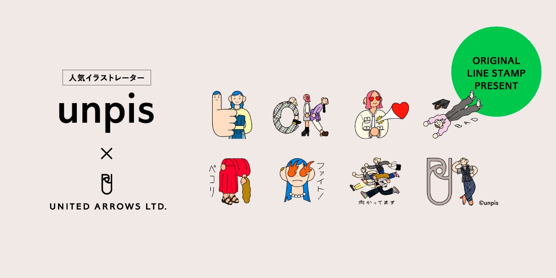 株式会社ユナイテッドアローズ(代表取締役 社長執行役員 CEO: 松崎 善則、本社所在地:東京都渋谷区)は、初めての取り組みとしてLINEスタンプを制作しました。イラストレーターのunpis(ウンピス)さんがデザインを手掛け、日常生活やお仕事のコミュニケーションなどで楽しく使える8種類のLINEスタンプです。ユナイテッドアローズLINE公式アカウント「UNITED ARROWS LTD.」の友だち追加によって無料ダウンロードが可能で、本日2024年2月1日(木)に配信を開始します。