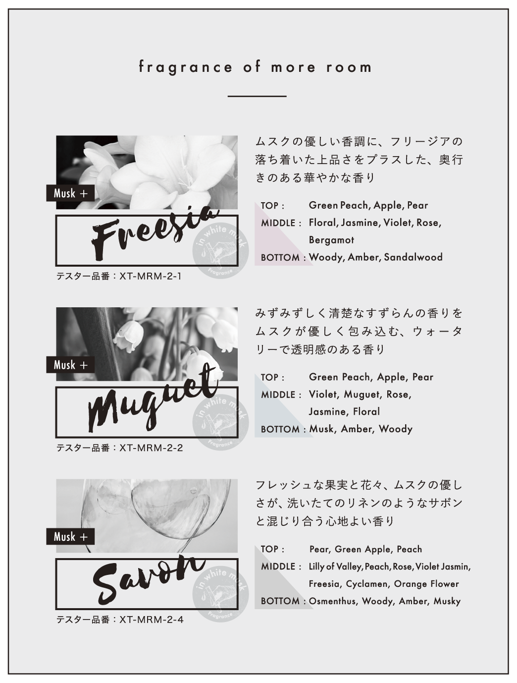 爽やかな甘さのムスクをベースに、相性の良いフリージア、ミュゲ、サボンを調香。