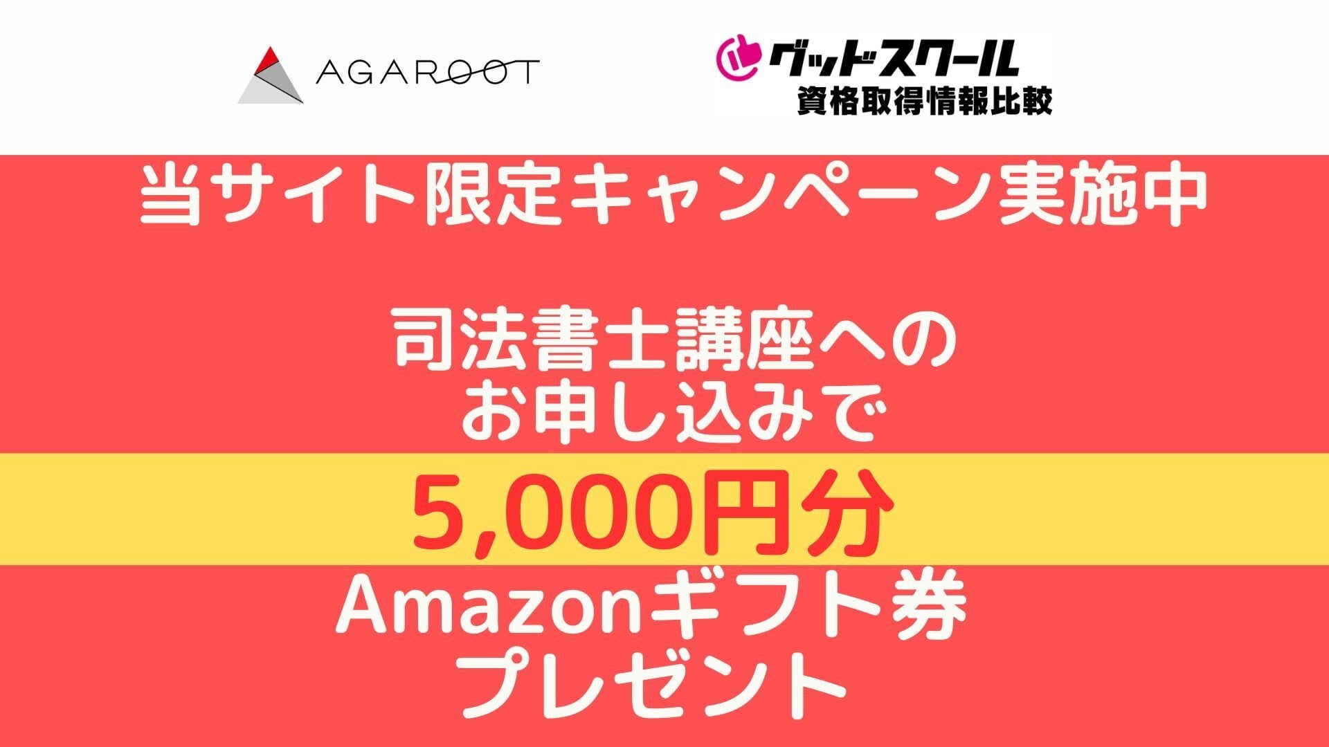 「グッドスクール・資格取得情報比較」のサイト(https://gooschool.jp/online/shihoushoshi-tsushin/)から、アガルートの司法書士試験講座の対象講座をお申し込みいただいた方に、Amazonギフト券5,000円分をプレゼントいたします。