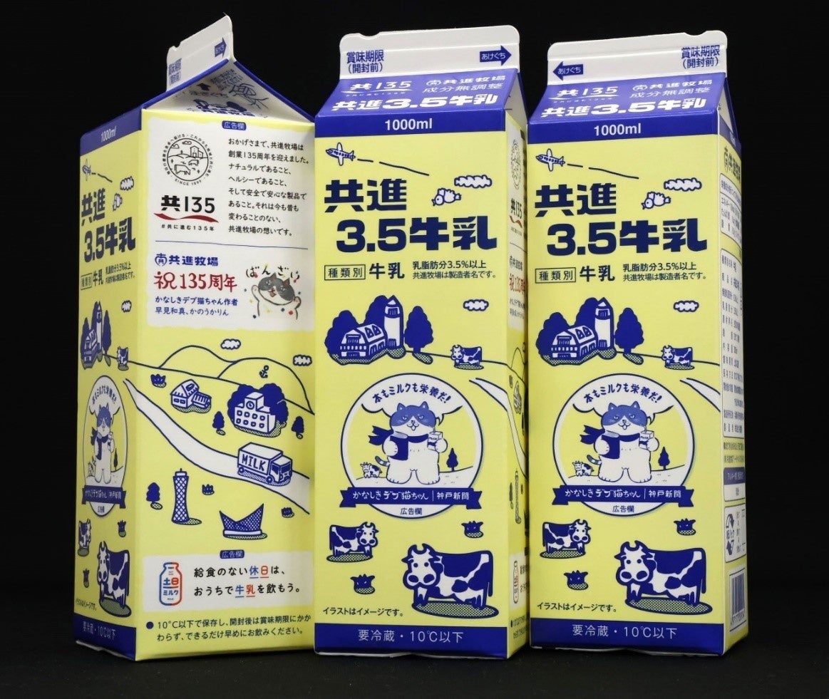 「共進3.5牛乳」(1000ml)もデブ猫ちゃんコラボパッケージも共進牧場創業135周年に合わせてリニューアル!! 兵庫県内および京阪神エリアで販売します。
