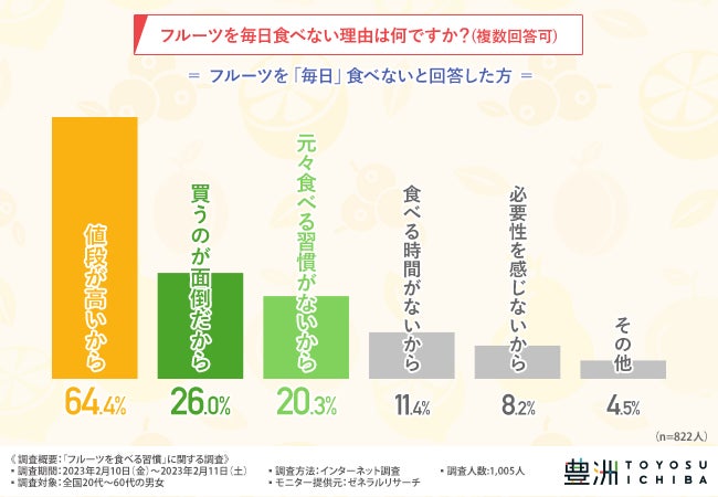 続いて、「フルーツを毎日食べない理由は何ですか?(複数回答可)」と質問したところ、『値段が高いから(64.4%)