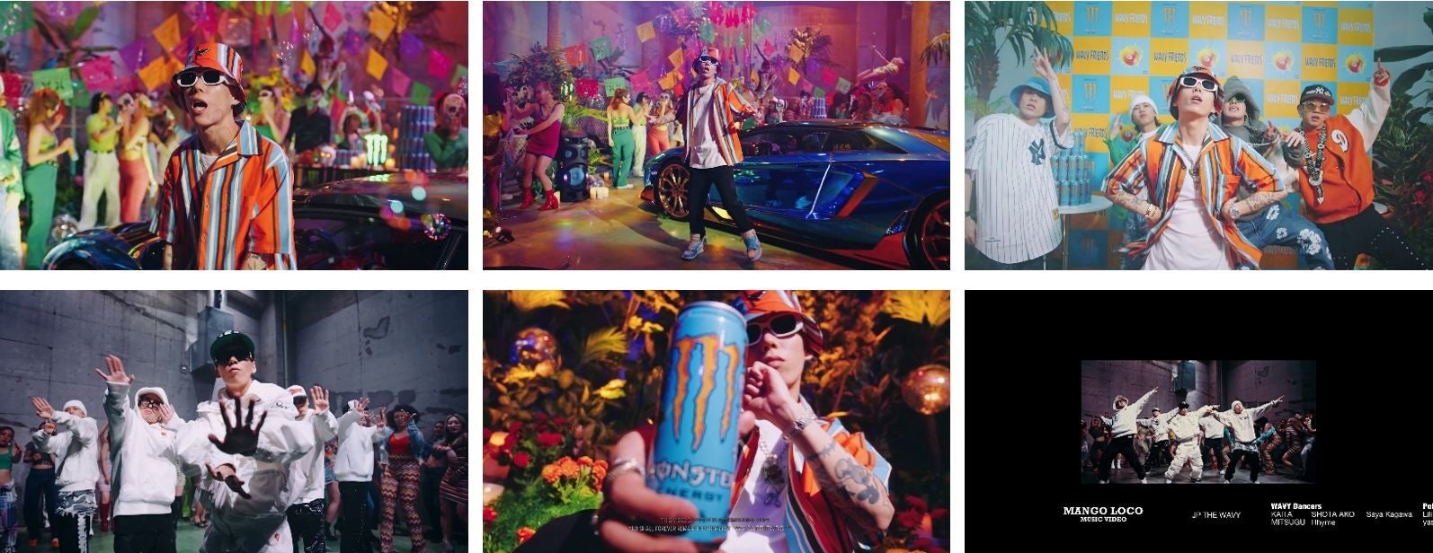 ガイコツの仮面を手に『モンスター マンゴーロコ』を飲んで踊るパーティーシーンやマリーゴールドに彩られた場所でJP THE WAVYがリップするシーンなど、『モンスター マンゴーロコ』の世界観が存分に表現された内容となっている。