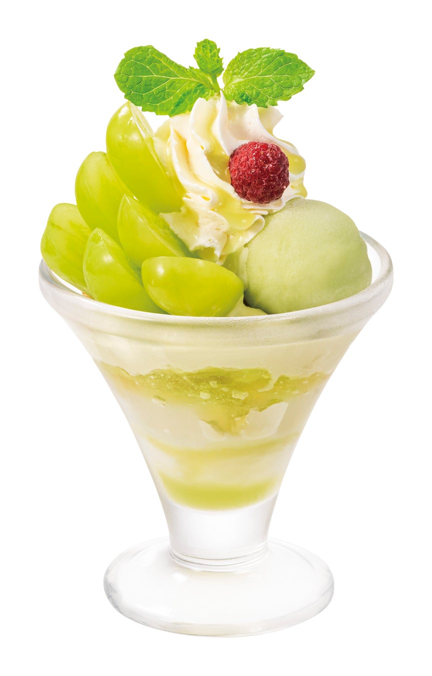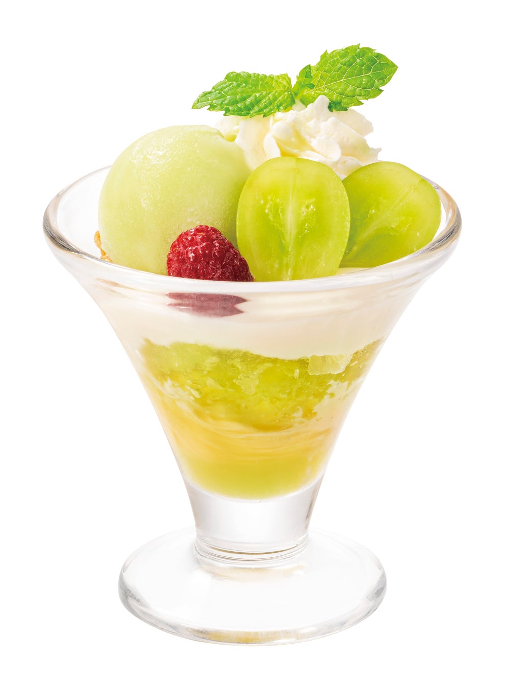シャインマスカットを贅沢にトップに13粒、中に2粒の合計15粒使用。スプラッシュサンデーの名の通り、トップに彩ったシャインマスカットはカットせずに粒ごと使用しており、みずみずしいはじける食感をお楽しみいただけます。