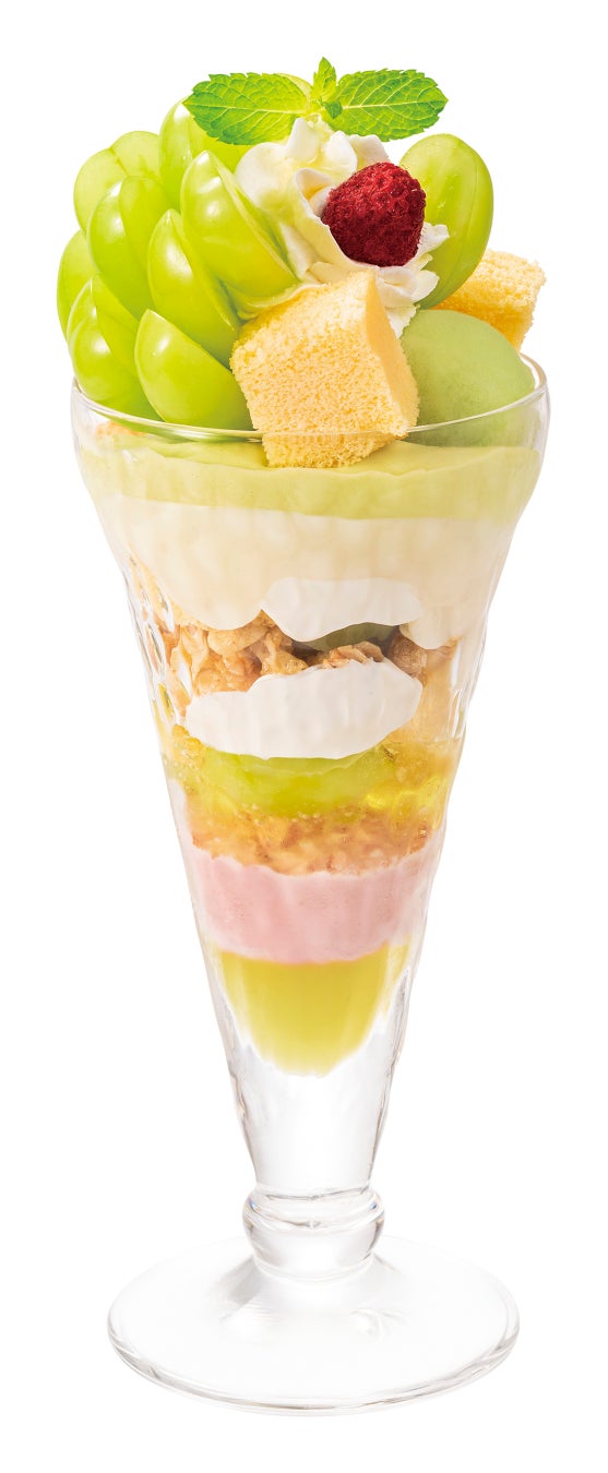 しっとりふんわりと焼き上げたスポンジに、白ぶどうのクリームやソースを合わせて風味満点に仕立てました。メインとしても食後にも様々なシーンでお楽しみいただけるサイズになっており、グラスの底から上の盛り付けまで、視覚と味覚で余すことなくご堪能いただけます。