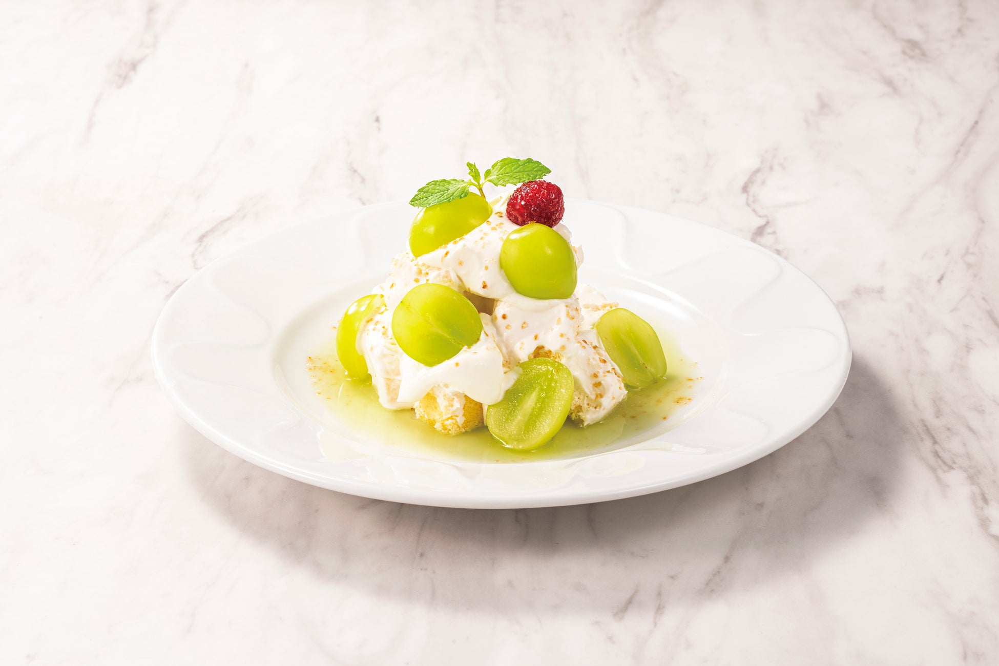 皮ごと食べられるシャインマスカットをはじめ、さっぱりとしたソルベ、ゼリー、ソースに、白ぶどうと相性の良いレモンチーズクリーム、バニラアイスを合わせた、食後にぴったりのデザートです。