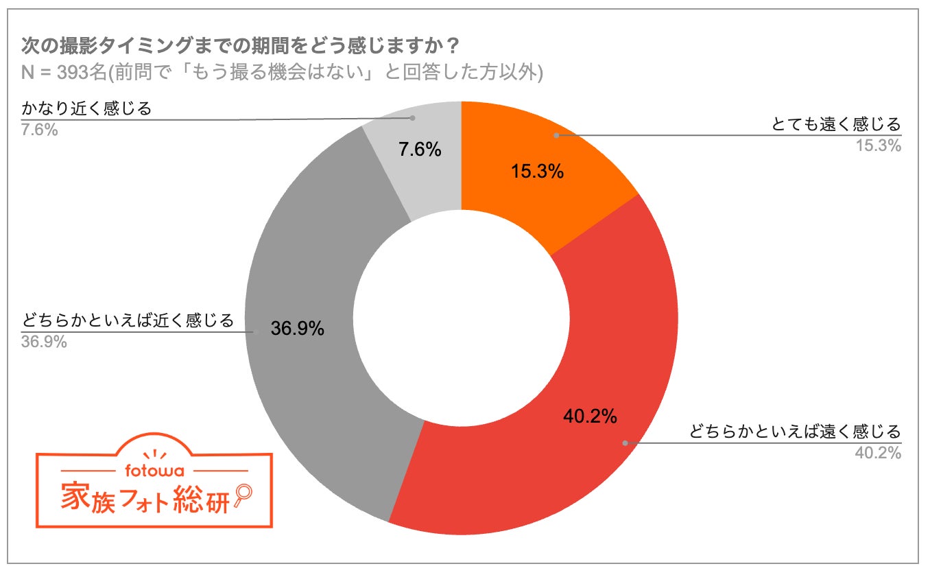 次の撮影タイミングまでの期間をどう感じるかは、「とても遠く感じる」が15.3%、「どちらかといえば遠く感じる」が 40.2%と、半数以上が遠いと感じていることがわかりました。お子さまが成人し、子育てがひと段落すると、家族が揃う機会は減少しがち。成人式は子どもと一緒に家族写真を撮る重要なチャンスだと言えそうです。