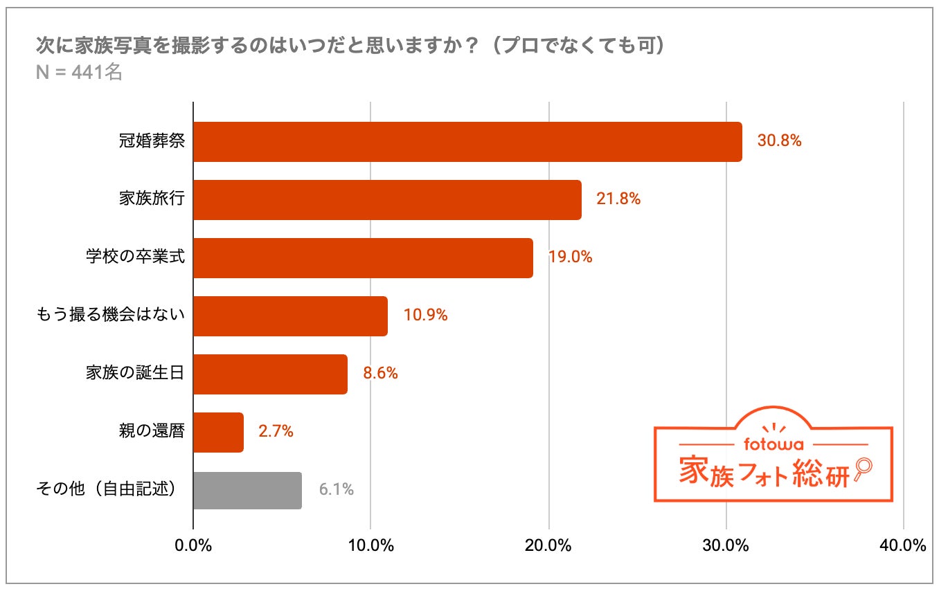 成人式を終え、次に家族揃って写真撮影をするのはいつになると思うか伺うと、「冠婚葬祭」(30.8%)が最も多く、次いで「家族旅行」(21.8%)、「学校の卒業式」(19.0%)という結果になりました。また、10.9%の人は「もう撮る機会はない」と回答しており、成人式が家族写真を撮る最後の機会になるという方もいました。