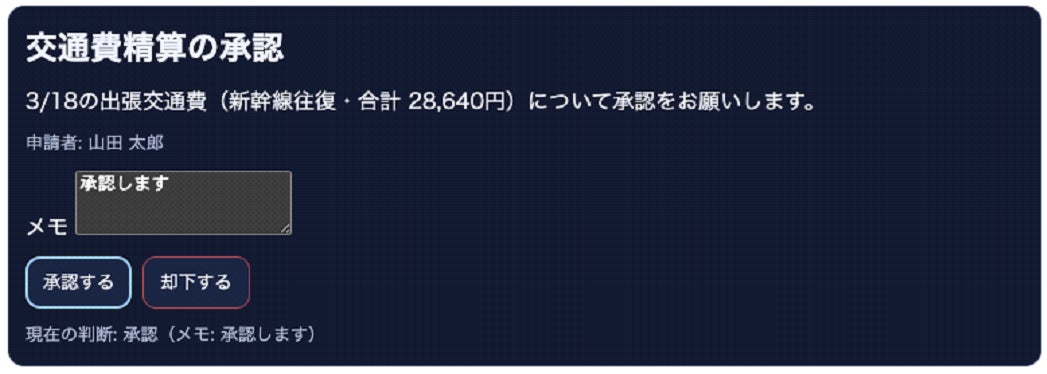 申請内容の確認から、理由などのコメント入力、[承認]または[却下]の操作まで、すべてチャット画面内で完結できます。別の画面を開く手間がありません。