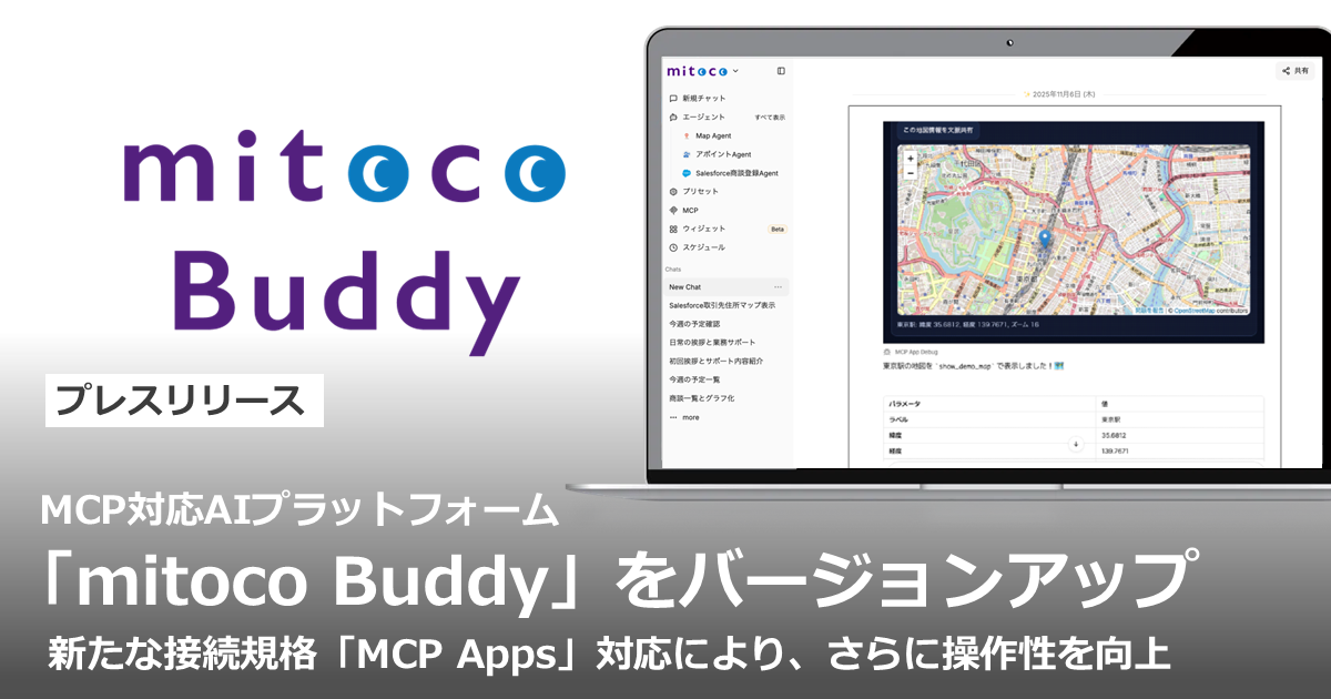 株式会社テラスカイ(本社:東京都中央区、代表取締役CEO 社長執行役員:佐藤 秀哉、以下「テラスカイ」)は2026年4月6日(月)に、MCP(Model Context Protocol)対応のAIプラットフォーム「mitoco Buddy」のバージョンアップを実施します。