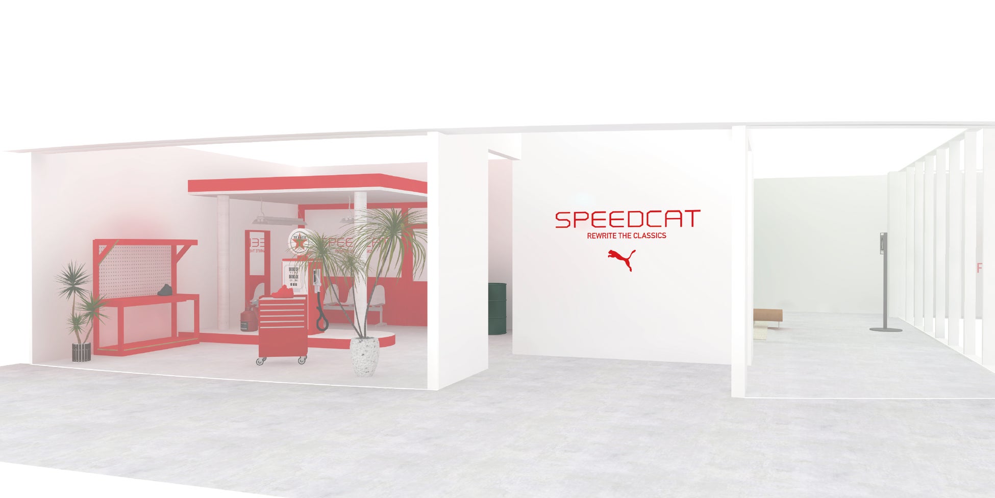 SPEEDCATは、耐火レーシングシューズをルーツとしたライフスタイルシューズという特徴に因み、グローバルアンバサダーを務めるRosé(ロゼ)とDua Lipa(デュア・リパ)を起用したレーシングスタイルや、ロードトリップを気ままに楽しむ姿を通して、ルールに縛られない自由さと冒険心を表現してきました。今回のPOP-UPではこのSPEEDCAT独自の世界観を表現できるよう、ガソリンスタンドやモーテルを彷彿とさせる空間演出を採用し、レーシングスタイルのインスピレーションを随所に散りばめ、来場者がSPEEDCATのストーリーに没入できる場を提供します。