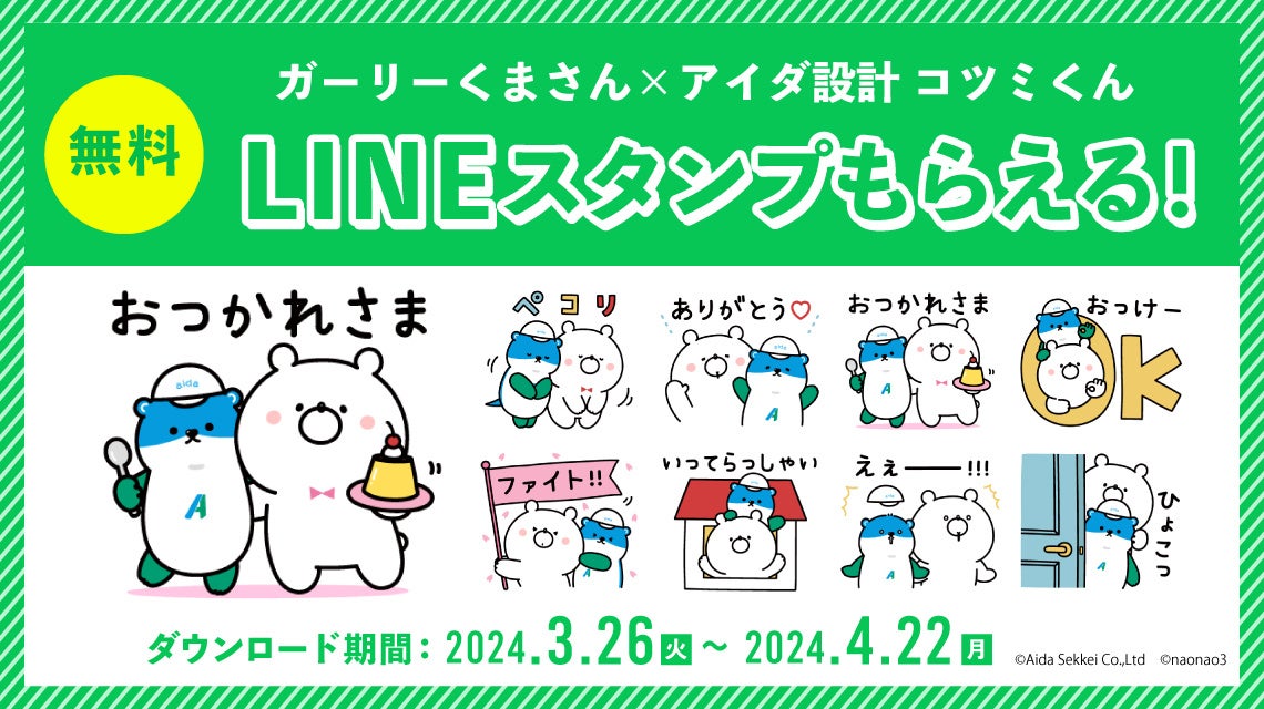 この度、株式会社アイダ設計(本社:埼玉県さいたま市大宮区桜木町、代表取締役社長:會田 貞光)は、アイダ設計公式マスコットキャラクター「アイダ コツミくん」と人気キャラクター「ガーリーくまさん」とのコラボLINEスタンプを3月26日(火)より期間限定で無料配信いたします。