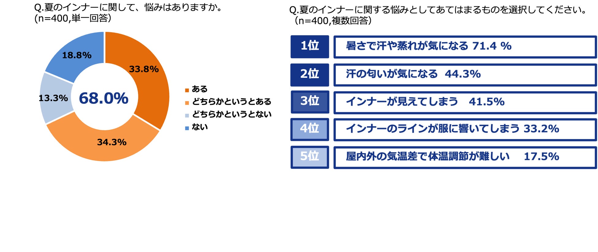 1.約7割の人が夏のインナーに関して悩みがあると回答、悩みランキングTOP3は「暑さで汗や蒸れが気になる」「汗の匂いが気になる」「インナーが見えてしまう」という結果に。