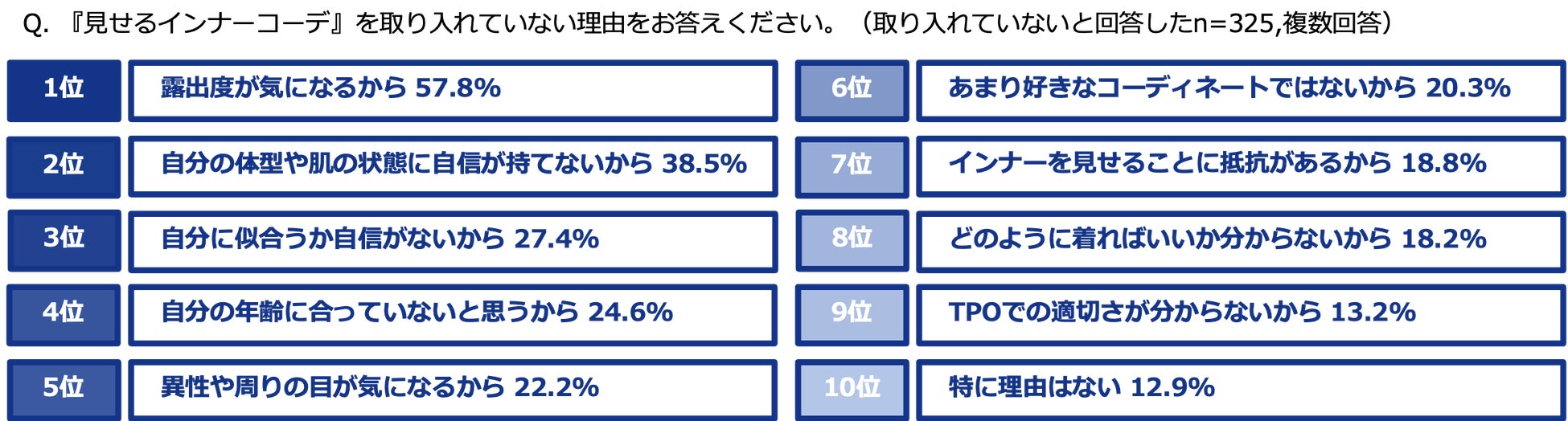 『見せるインナーコーデ』をまだ取り入れていない人に対して理由を聞いたところ、「露出度が気になるから(57.8%)」が最も多い回答となりました。暑い季節になると多くの人が涼しさを求める一方で、露出度が高いファッションに対しては、自身の体型や見た目に対する不安の声があがりました。次いで、「自分の体型や肌の状態に自信が持てないから(38.5%)」「自分に似合うか自信がないから(27.4%)」「自分の年齢に合っていないと思うから(24.6%)」「異性や周りの目が気になるから(22.2%)」という結果となりました。