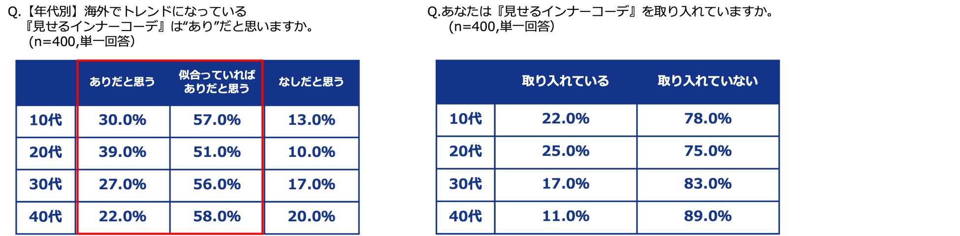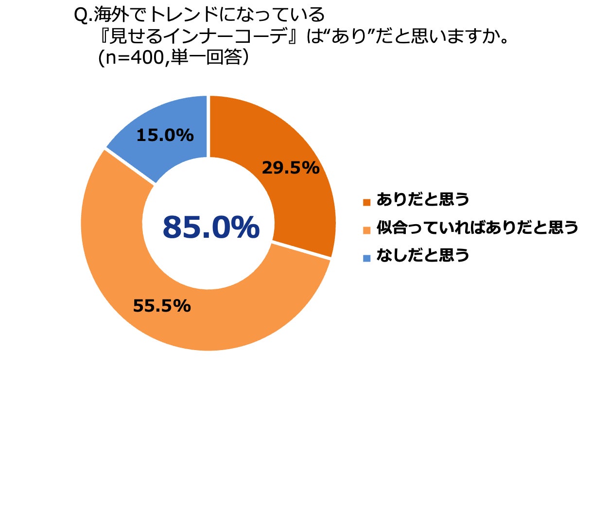 海外でトレンドになっている『見せるインナーコーデ』は“あり”だと思うかという問いに対して、「ありだと思う(29.5%)」、「似合っていればありだと思う(55.5%)」と8割以上(85.0%)が“あり”と回答。世代別でみると、10代・20代は約9割と特に高い数字を示しており、30代・40代も約8割が「あり」と回答、『見せるインナーコーデ』が幅広い世代に受け入れられていることが判明しました。
