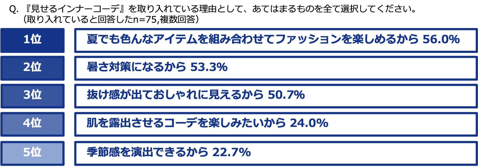実際に『見せるインナーコーデ』をファッションに取り入れている人に対して、取り入れている理由を聞いたところ、「夏でも色んなアイテムを組み合わせてファッションを楽しめるから(56.0%)」「暑さ対策になるから(53.3%)」「抜け感が出ておしゃれに見えるから(50.7%)」という回答が多く、ファッションを楽しむためのトレンドとして『見せるインナーコーデ』が支持されていることがうかがえます。