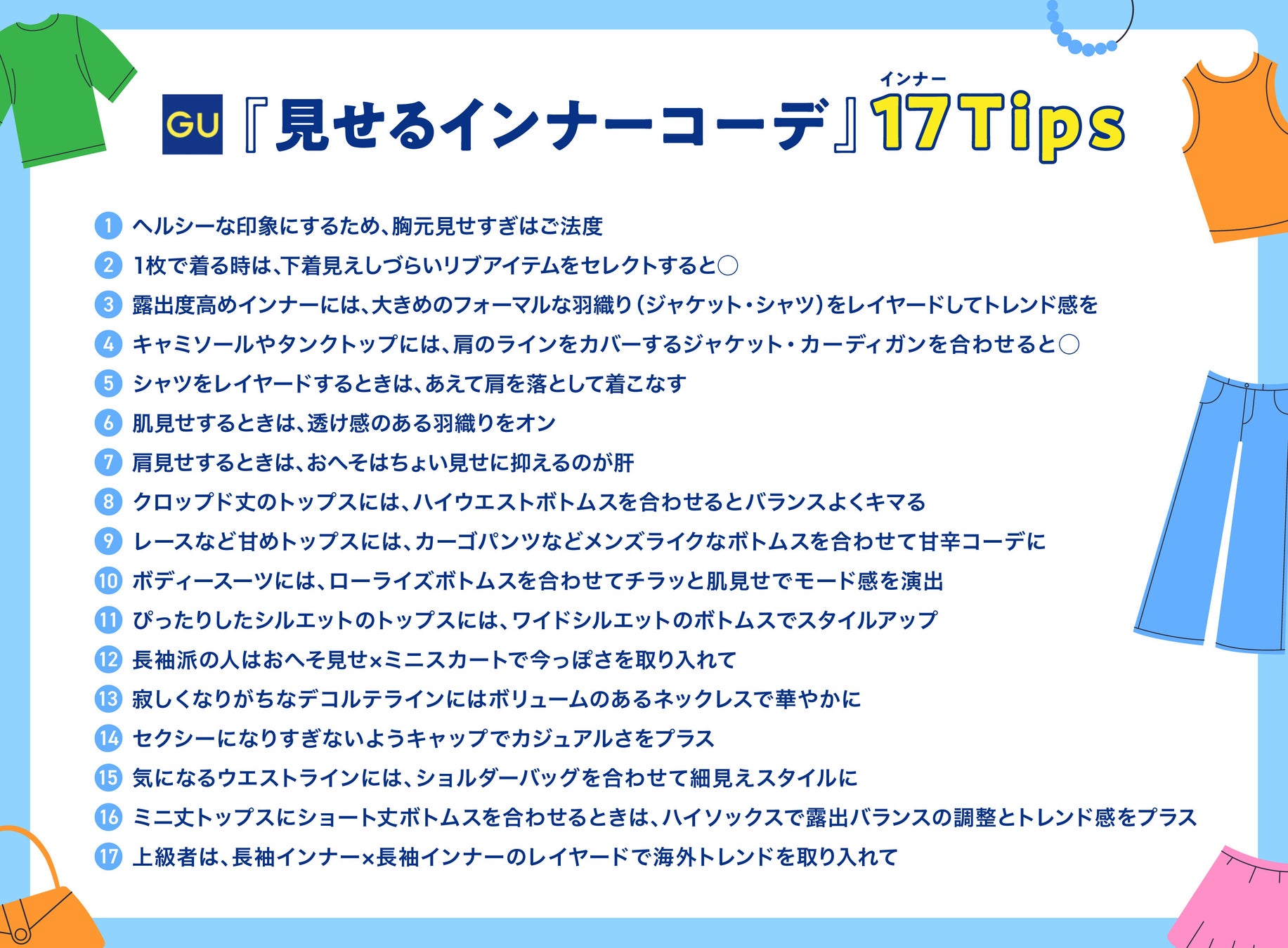 ジーユーは、こうした調査結果を踏まえ、一人でも多くの方にトレンドの『見せるインナーコーデ』を楽しんでいただけるよう、3か条と17のTipsを公開いたします。