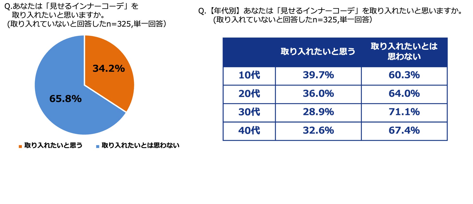 『見せるインナーコーデ』をまだ取り入れていない人のうち、全体の3割以上が「取り入れたいと思う(34.2%)」と回答し、 『見せるインナーコーデ』に挑戦したい意向があることが判明しました。