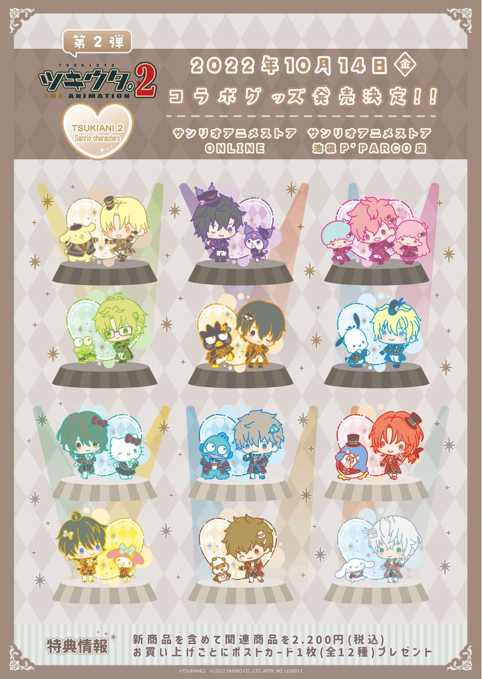 ポストカードは「ツキウタ。 THE ANIMATION 2×サンリオキャラクターズ」の新商品を含む関連商品を税込み2,200円お買い上げごとに、12種類からランダムで1枚お渡しします。