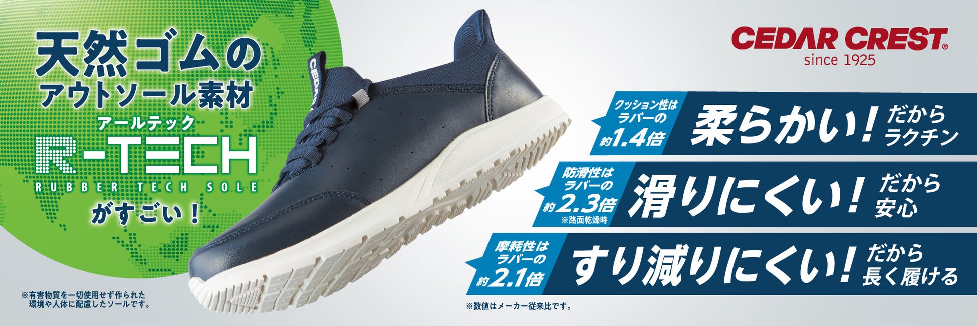 地球に優しい天然素材「R-TECHソール」搭載、セダークレストの新作スニーカー、全国のシュープラザ、東京靴流通センター他で発売。モノ系Webメディア「GetNavi web」で優れた機能を検証。