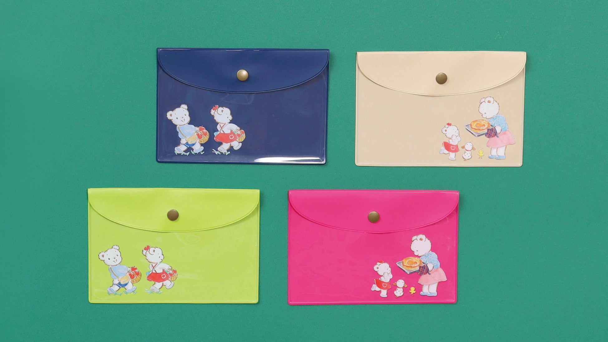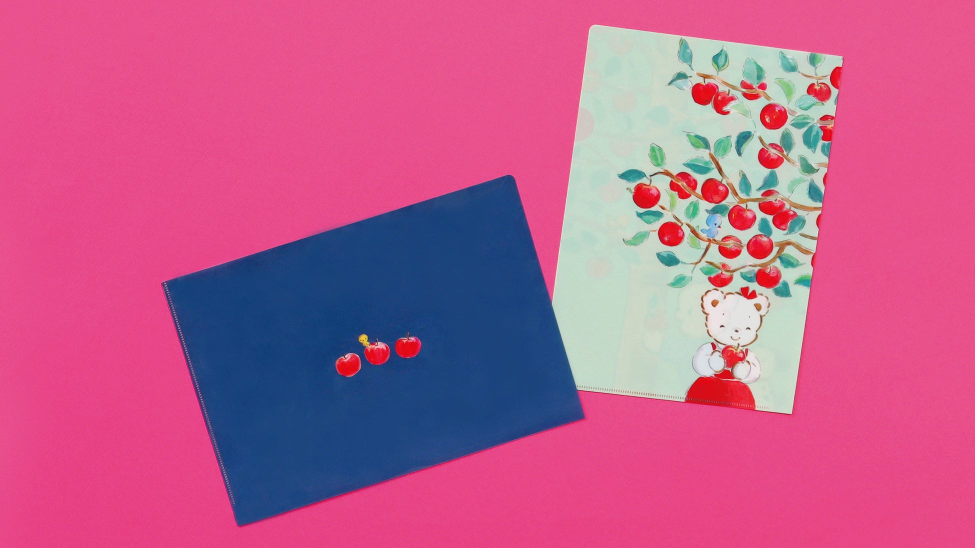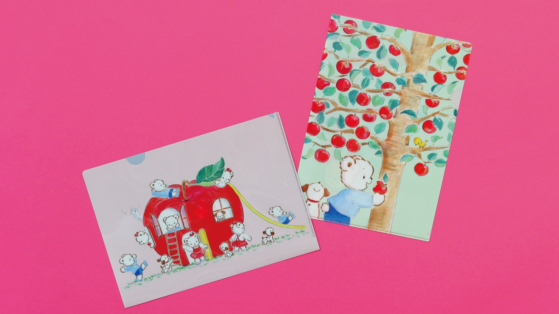 「ファミちゃん リアちゃん りんご だいすき」の絵本の中に登場する、印象的なシーンを切り取ったクリアファイルとクリアケースが新登場。ポップアップ限定アップルパイとリンクしたデザインでお土産にもおすすめです。