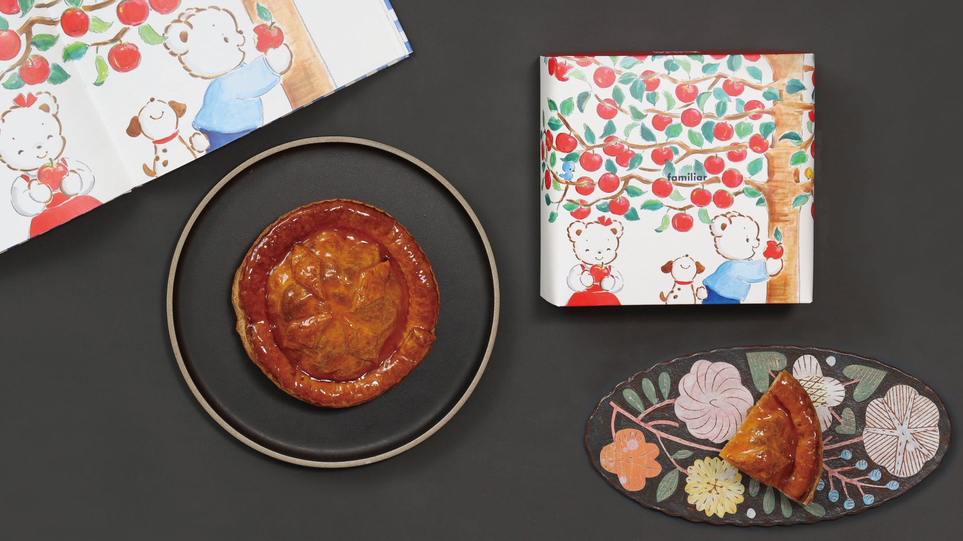 老舗洋菓子店「ユーハイム」とのコラボレーションアップルパイ。バターをたっぷりと練り込んだ「耳まで美味しい」アップルパイは、ラムレーズンやアンズジャムなどアクセントになる素材にもこだわっています。ファミリアの絵本「ファミちゃん リアちゃん りんご だいすき」のアートを使用したポップアップ限定パッケージがポイントです。