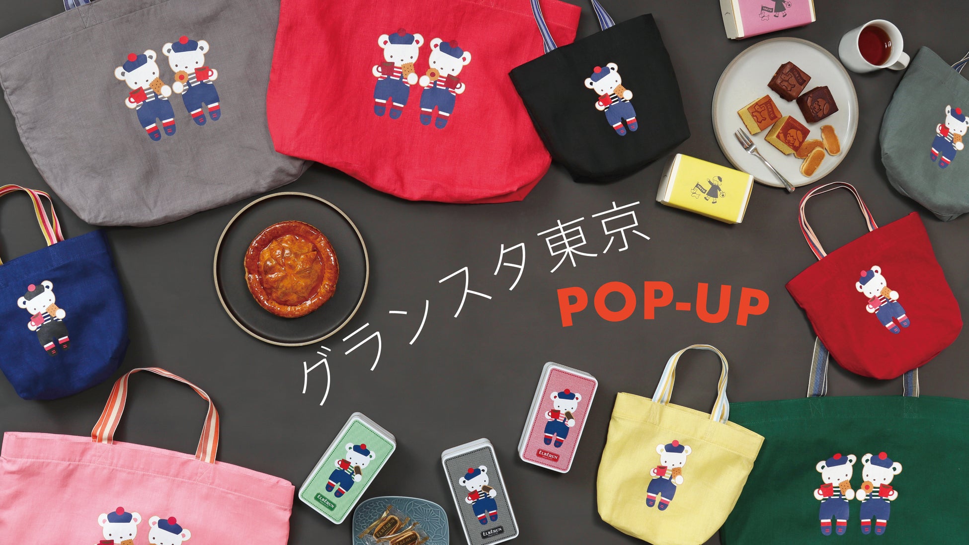 ポップアップ開催を記念し、ファミリアと同じく近畿地方に拠点をもつスイーツブランド3社とのコラボスイーツを企画。兵庫県西宮市夙川の洋菓子店「エルベラン」のクッキー缶、神戸市発の老舗洋菓子店「ユーハイム」のアップルパイ、三重県発のカステラ専門店「DECARNERO CASTE」のカステラがポップアップ限定デザインで登場します。ほかにもクッキー缶のクマちゃんのアートとリンクしたポップアップ限定のトートバッグや、アップルパイのパッケージと同じデザインの新作ステーショナリーがラインナップいたします。