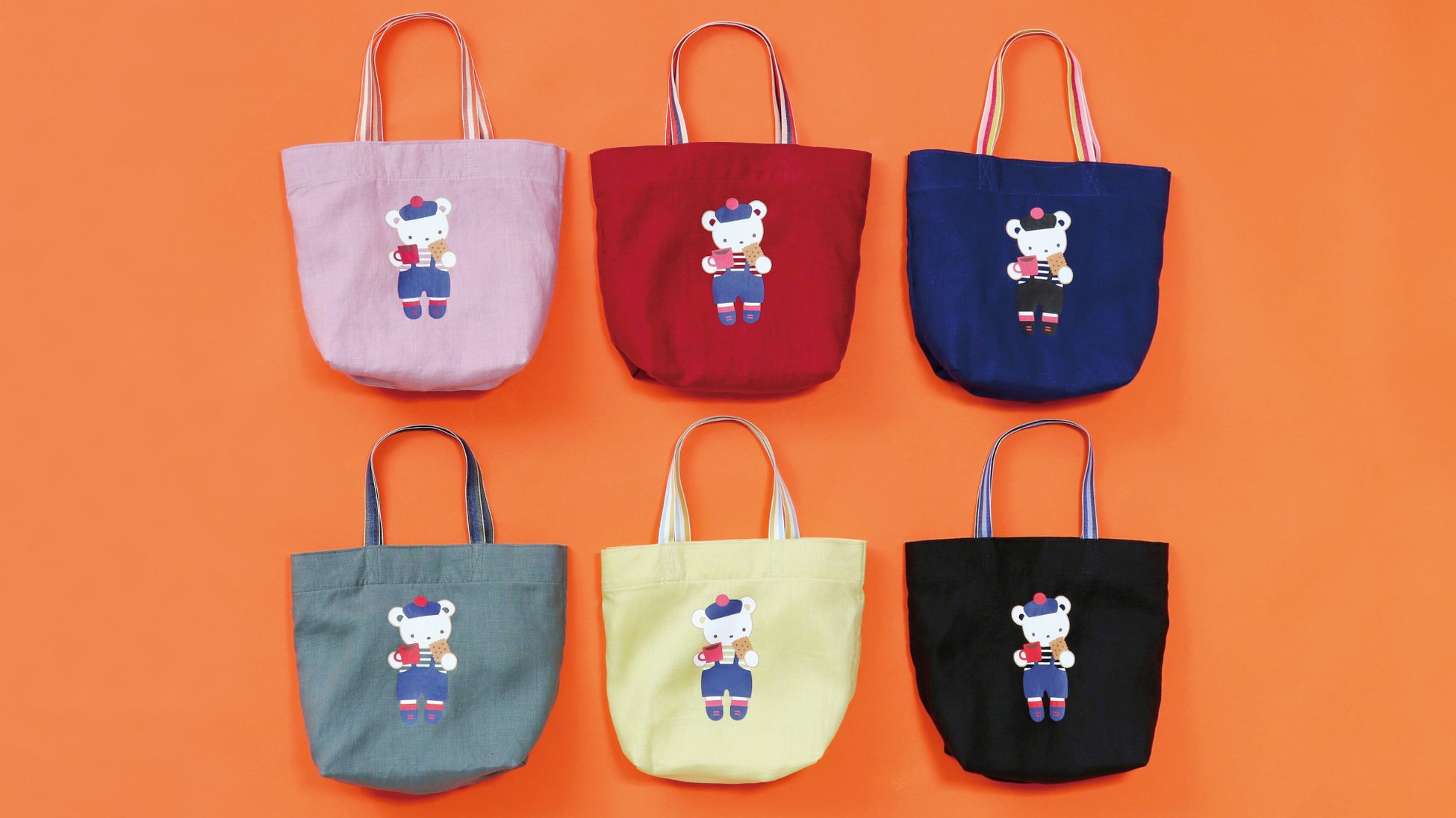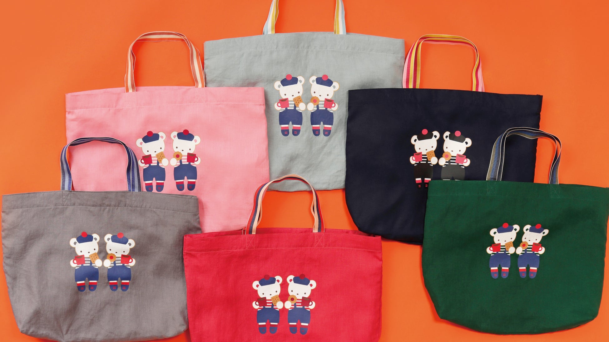 クッキーをおいしく食べながらティータイムを楽しむクマちゃんの限定アートのトートバッグが登場。ふっくらとした風合いのあるリネン素材で、カラフルで優しい色使いとトリコロールの華やかな持ち手がポイント。軽くて柔らかく、持ち歩きやすいため、エコバッグにもおすすめです。