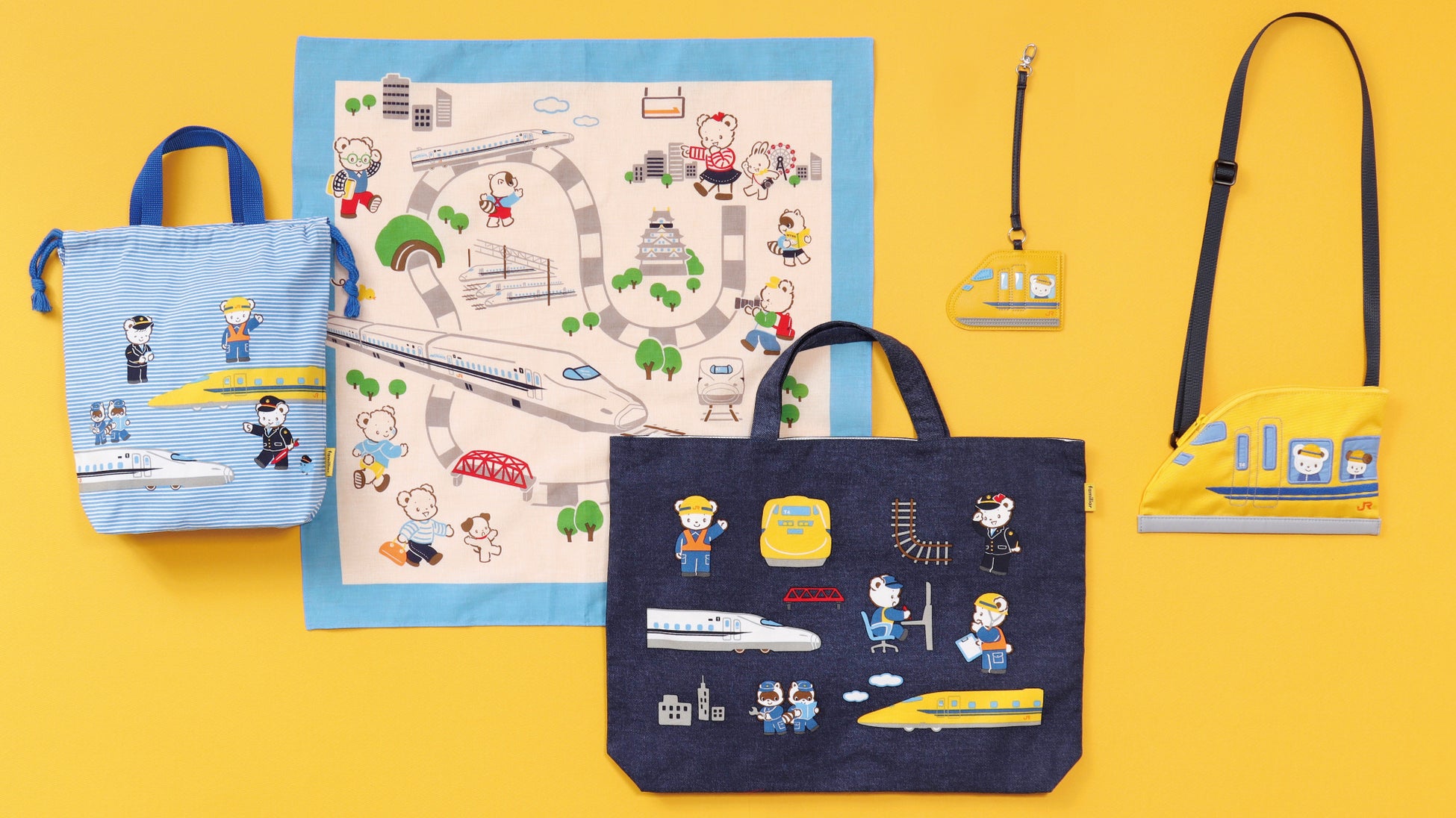 新幹線のお医者さん「ドクターイエロー」をテーマに、新幹線の安全な運行に携わるお仕事に取り組むファミちゃんとなかまたちが楽しく描かれたコラボアイテムをグランスタ東京ポップアップでも販売いたします。