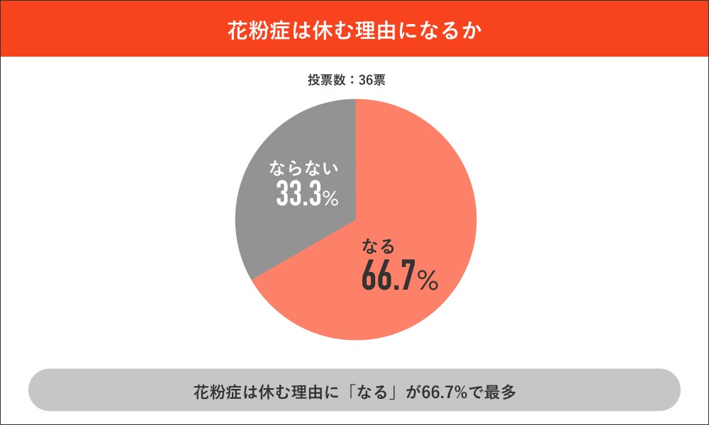スギ花粉が飛散するシーズンとなり、政府も対策を打つほど花粉症は重症度によって仕事に影響するケースもあります。回答者に、花粉症は休む理由になるかを聞くと、「なる派」が66.7%、「ならない派」が33.3%となりました。