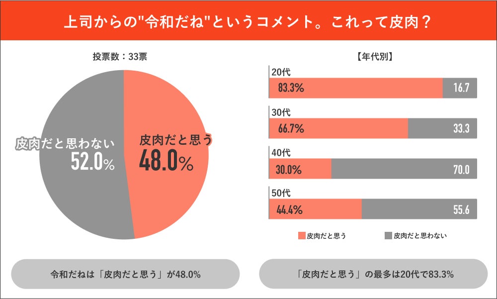 そこで回答者に、上司からの”令和だね”というコメントは皮肉か否かを聞くと、「皮肉だと思う派」が48.0%、「皮肉だと思わない派」が52.0%となりました。年代別では、「皮肉だと思う派」の最多が20代で83.3%となり、「皮肉だと思わない派」の最多が40代で70.0%となりました。