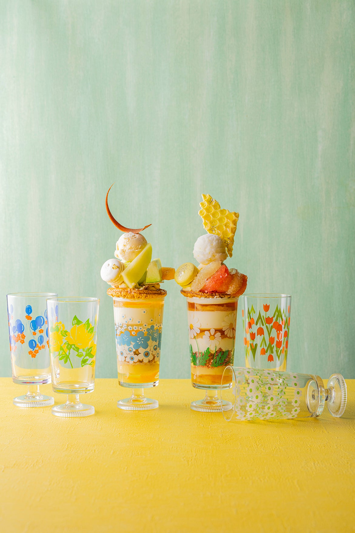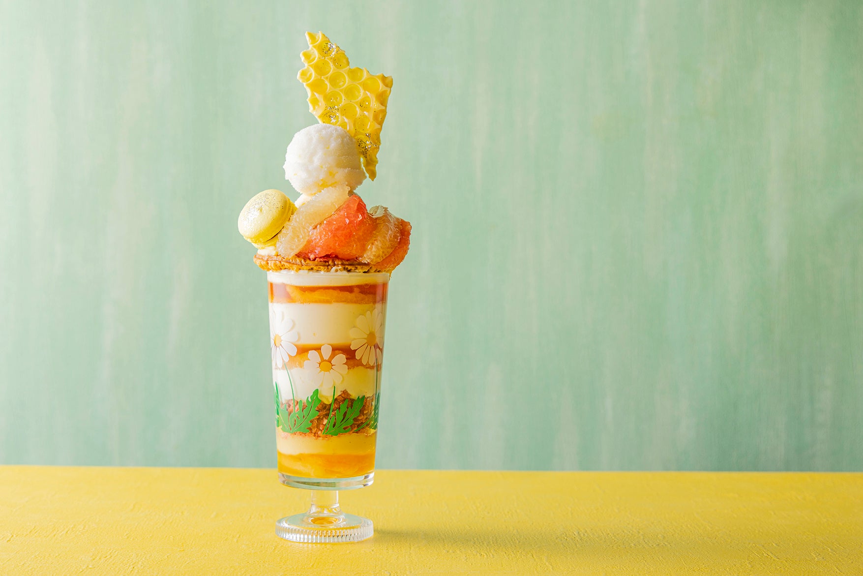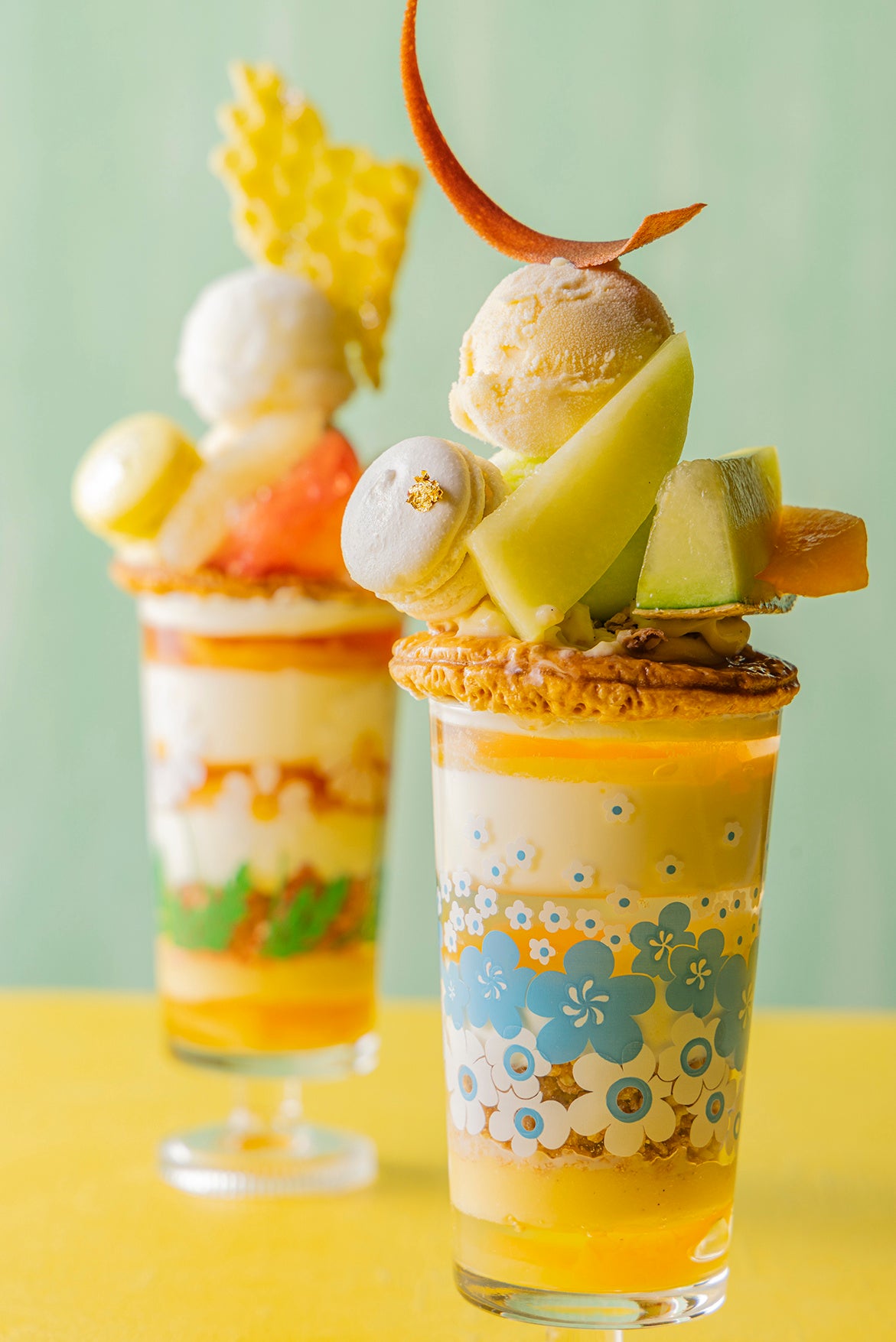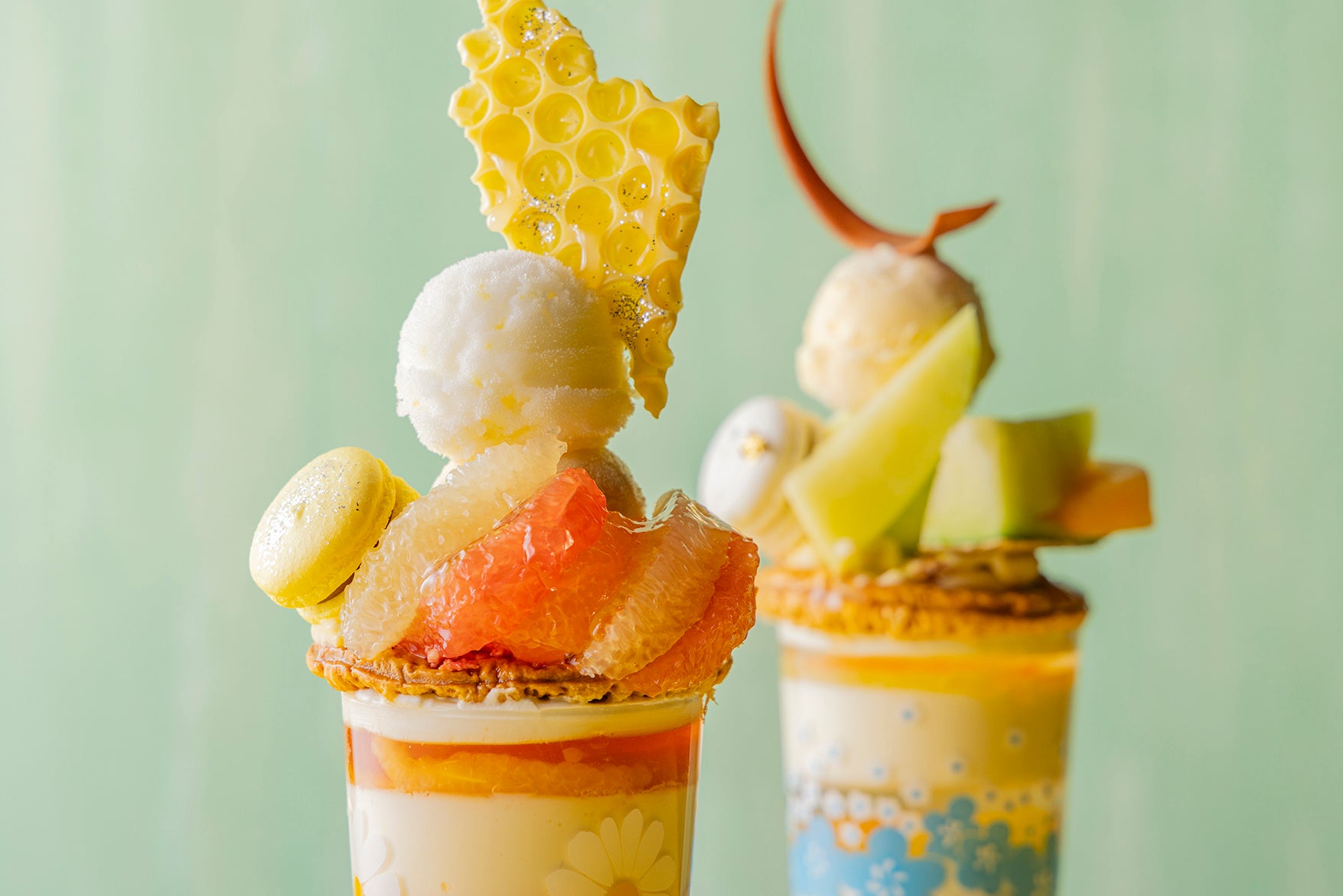 初夏に旬を迎えるメロンをリッチに味わえる「ポッピングリッチメロン」は、たっぷりの赤肉メロンと青肉メロンに華やかな香りとパチパチ弾ける食感も愉しめる贅沢なメロンパフェ。「シトラスハニーティー」は、オレンジはちみつのコクと香り高い紅茶に、フレッシュシトラスやレモンソルベの爽やかな酸味とのハーモニーが絶妙な、暑い夏の始まりにぴったりのさっぱりとしたシトラスパフェです。食べ進めるごとに異なる食感や味わいを堪能して。