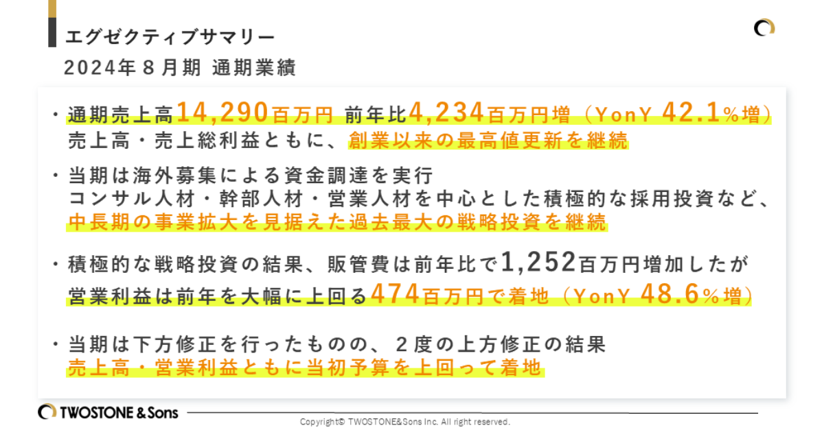 通期売上高は14,290百万円(前年比42.1%増)を達成し、前年比4,234百万円増となりました。売上高・売上総利益ともに、創業以来の最高値更新を継続しております。2024年8月期は、2024年4月に実施した海外募集による資金調達を実行し、コンサル人材・幹部人材・営業人材を中心とした積極的な採用投資など、中長期の事業拡大を見据えた過去最大の戦略投資を継続いたしました。