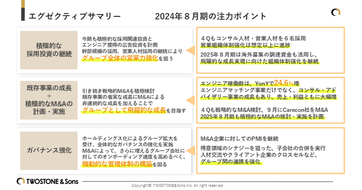 2024年8月期は、「積極的な採用投資の継続」「既存事業の成長および積極的なM&Aの計画・実施」「ガバナンス強化」の3点を注力ポイントとしてまいりました。