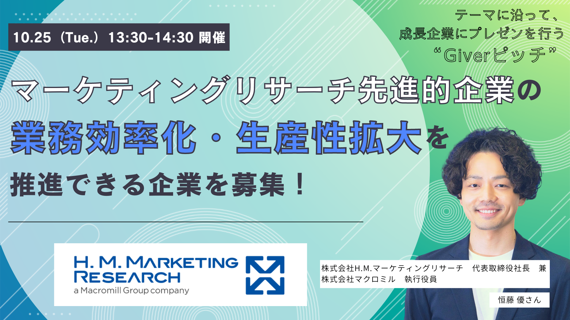これまで150回以上、大手企業と成長企業の課題解決型マッチングイベントを開催してきた当社が業務効率化・生産性拡大を支援する企業に出会えるマッチングイベントを開催することで、H.M.マーケティングリサーチ社の課題解決、延いては同様の悩みを抱えている企業の参考になると考え、この度、ビジネスマッチングを目的としたイベント「ギバーピッチ」を開催することといたしました。