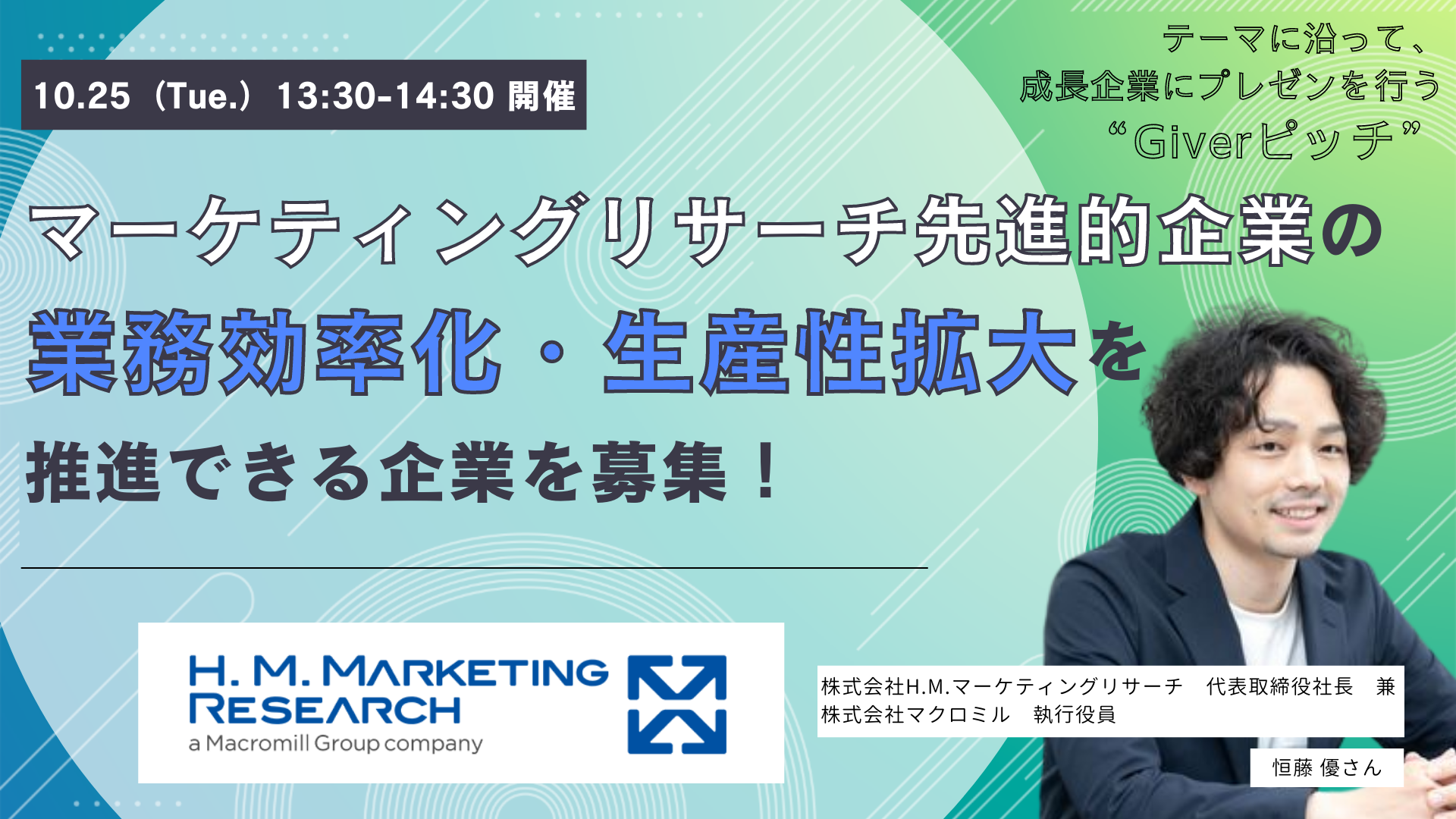 10月25日 (火)13時30分開始。業務効率化・生産性拡大に特化した企業を募り、株式会社H.M.マーケティングリサーチに対して提案を行うオンラインイベントを開催。