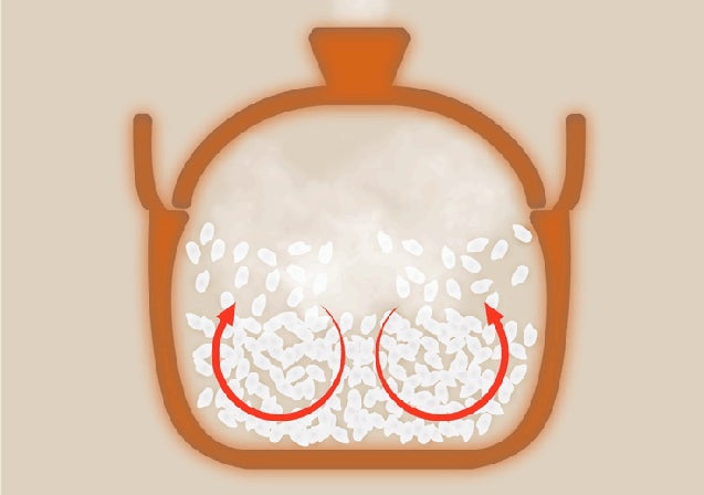 底から上層へ対流が生まれると熱が均一に伝わり、一粒一粒がふっくらと膨らみ美味しく炊きあがります。
