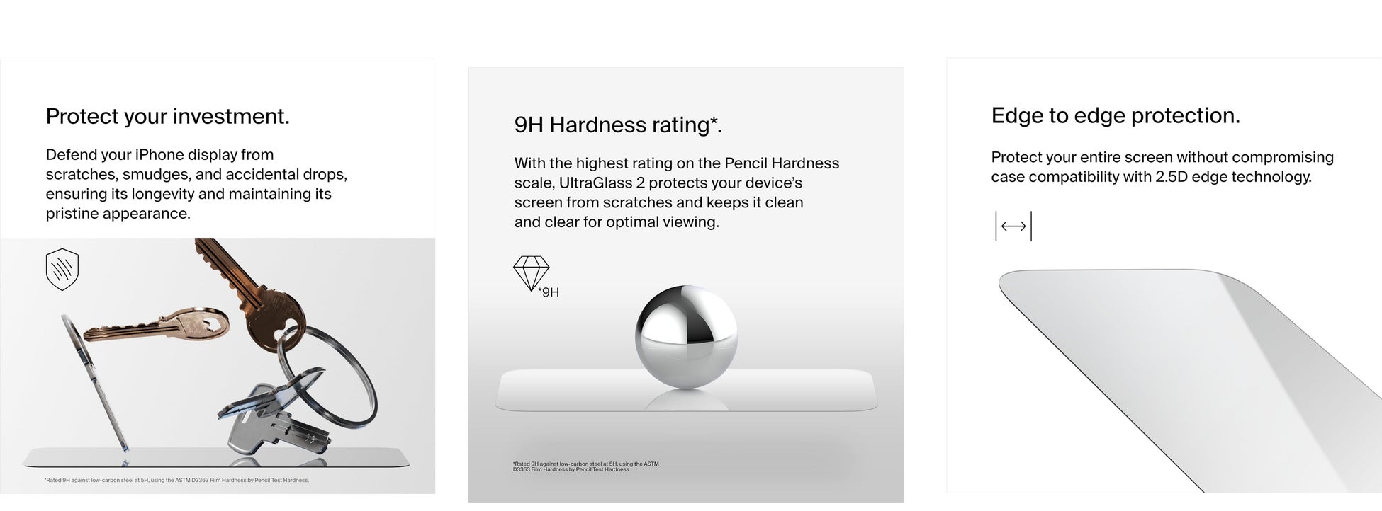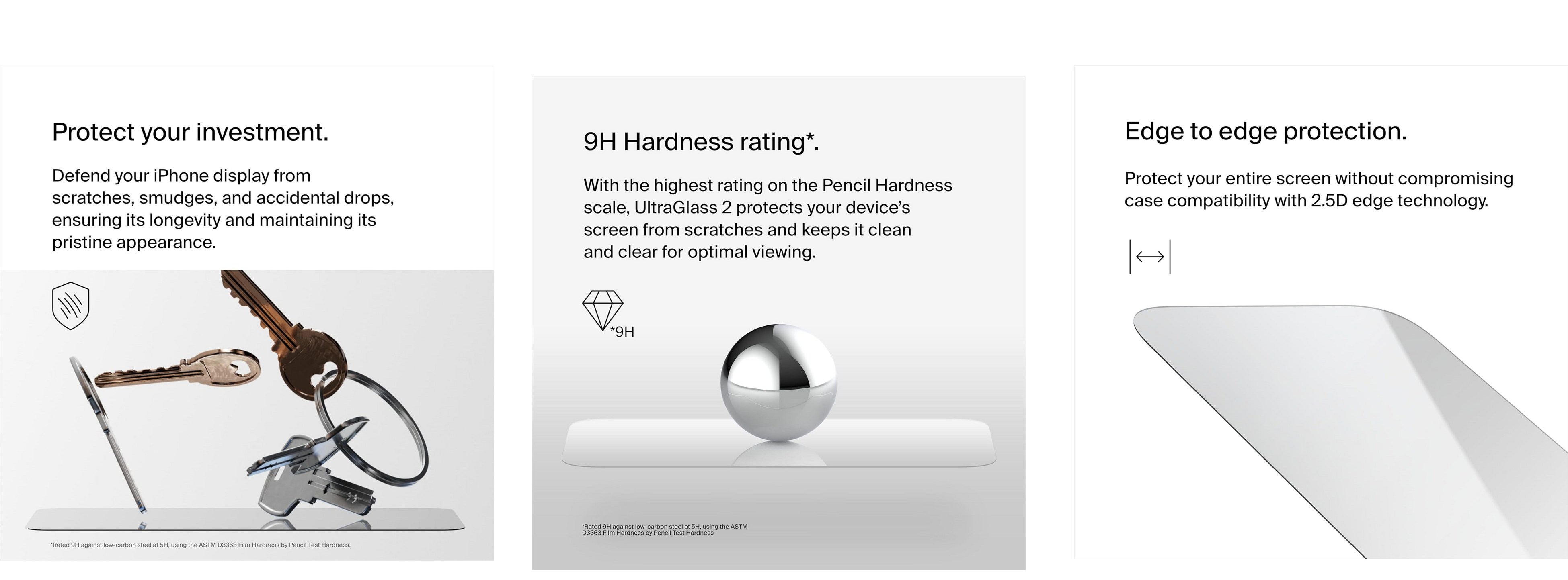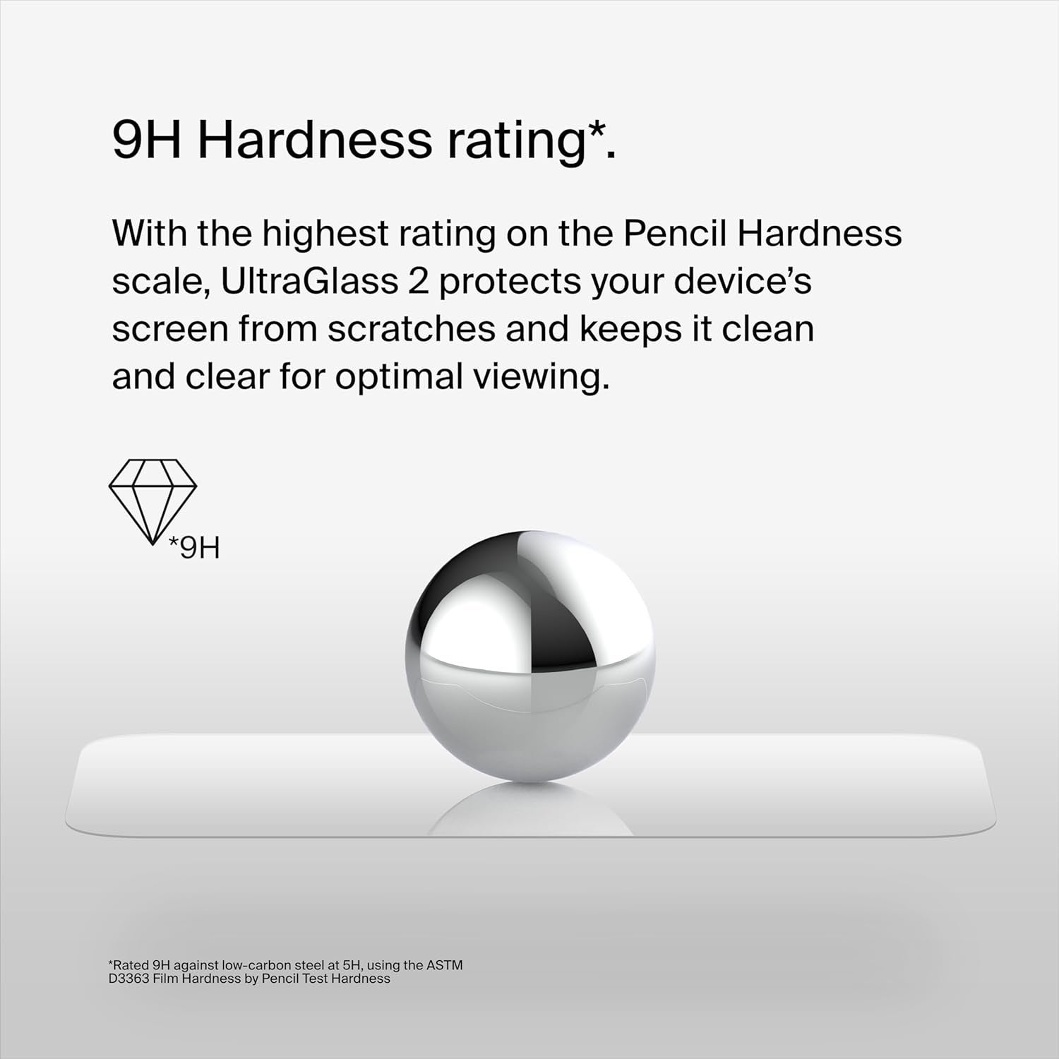 本製品は、iPhoen 15シリーズ専用のスクリーンプロテクターです。UltraGlass2はドイツ製超高耐久のグラスを採用しており、Belkin史上最高の耐久性と、0.29mm の薄さによる精密なタッチ感度を実現。強化ガラスよりも最大 2 倍の強度(9H)を持つタフな保護フィルムで、二重のイオン交換技術により落下や衝撃からデバイスを保護します。