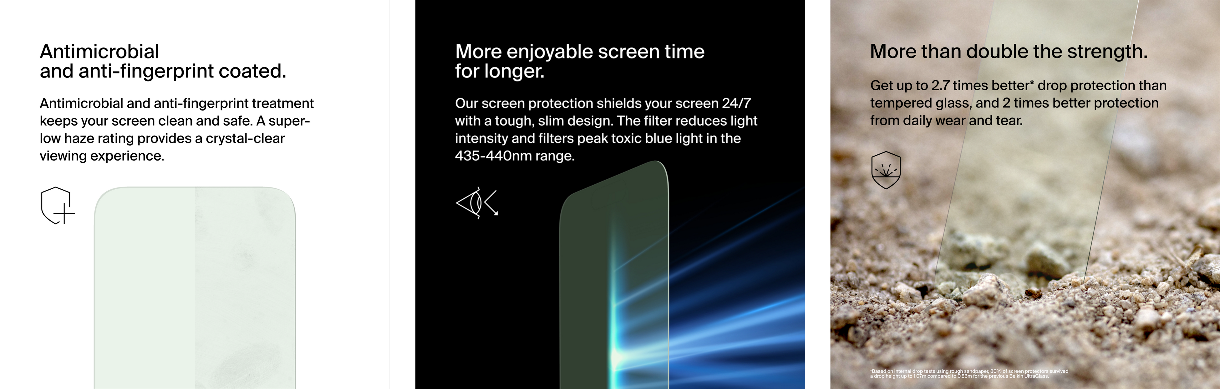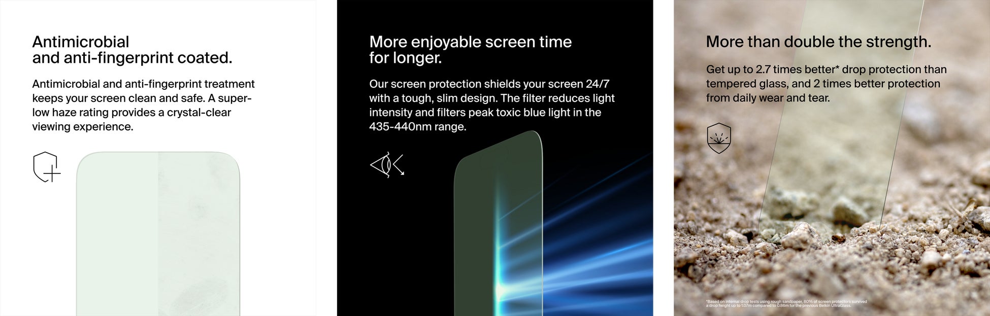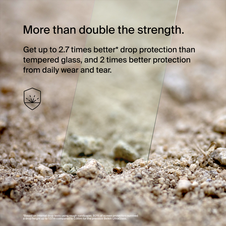 ・強化ガラスと比べて最大2.7倍の強度*:リチウムアルミノケイ酸塩(LAS)ガラスにより強度と柔軟性が向上し、傷に対する耐久性は最高レベルです。LASのフィルムは、従来のアルミノケイ酸ガラスや強化ガラスと比べて2倍以上の高さからの落下に耐えます。前モデルのBelkin UltraGlassよりも耐落下性能が24%向上*しました。