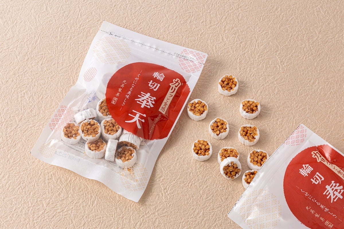 小麦粉を練りこんで豆状にし、油で揚げたかりんとう生地を、カリッとした有平糖で包んだ昔ながらのお菓子。1955年の創業以来、奉天菓子を専門に作り続けてきた丸英製菓のこだわりの水飴の配合率と加工により、歯につきにくいカリッとした食感を実現しました。ほんのりと桜が香る、春限定の商品です。