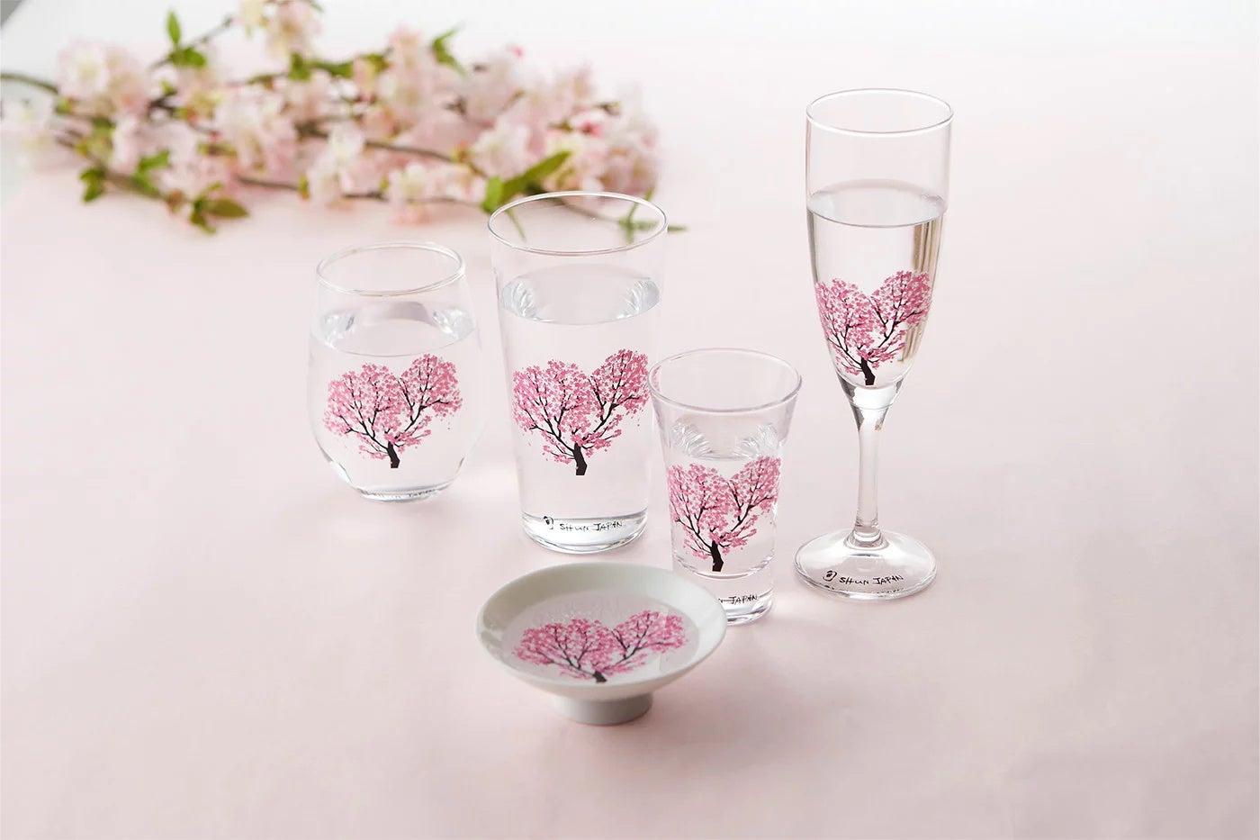 17℃以下の冷たい飲み物を入れると桜が花開くように色が広がる器のシリーズ。シャンパングラスやタンブラーなどサイズ・形状の異なるガラス製品4種と美濃焼の盃の全5種をラインナップ。