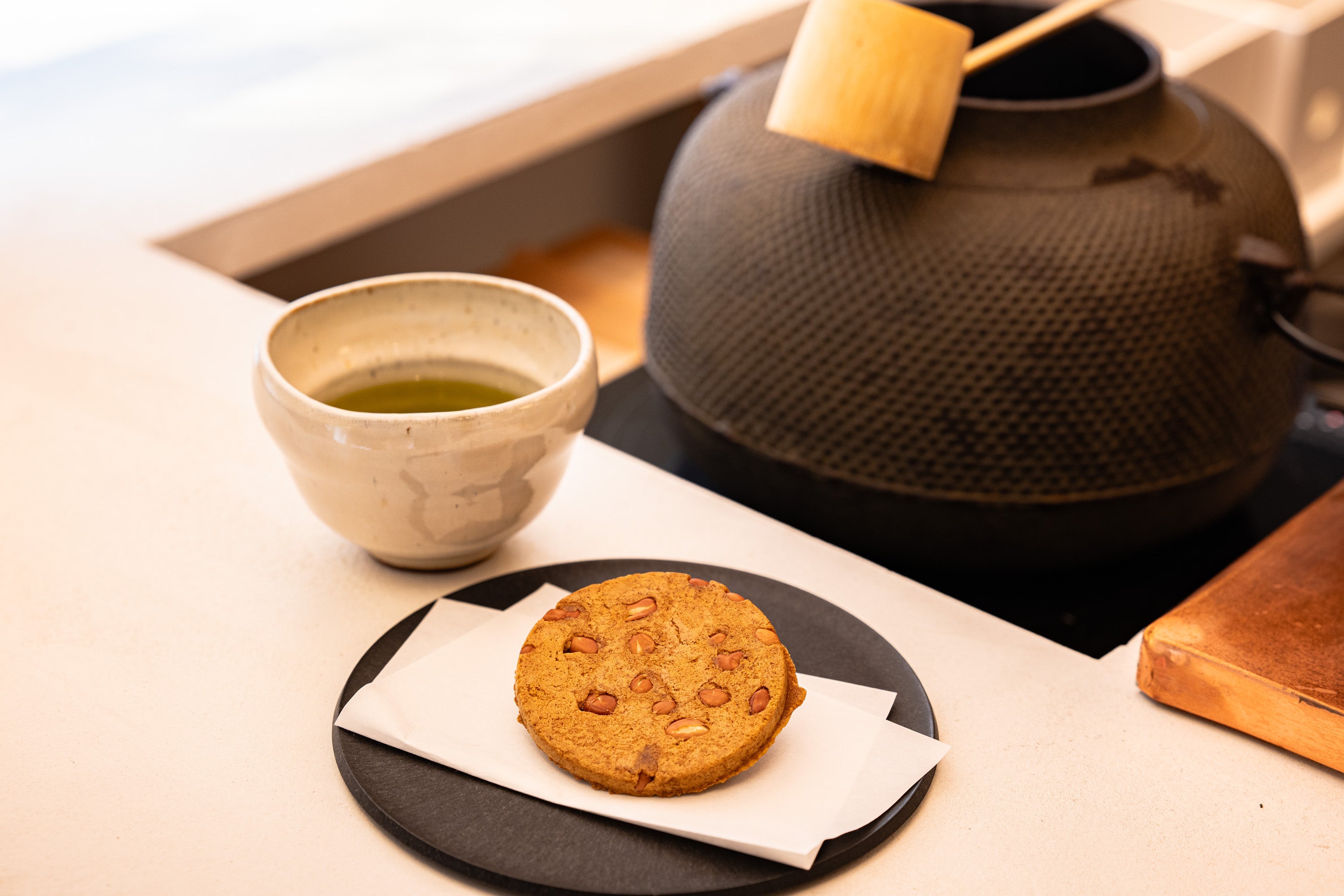 2026年の春のシーズンは、浅草馬道通り沿いにある老舗煎餅屋「浅くさ憧泉堂」の手焼き煎餅のセット。創業50年の歴史ある「浅くさ憧泉堂」は、店先で焼いているアツアツのお煎餅を提供している人気の煎餅店です。販売している全7種の煎餅の中から、店主おすすめの「ピーナッツ」をご用意します。日本茶は、注文を受けてから丁寧に煎れる「特上煎茶」もしくは「ほうじ茶」のいずれかをお選びください。