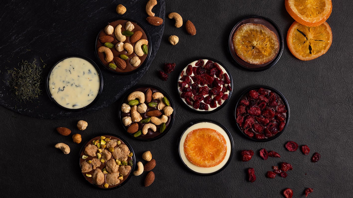 ビター、ミルク、ホワイトの3種の丸型板チョコに、ドライフルーツやナッツなどをトッピング。様々な食感や風味をお楽しみいただけます。